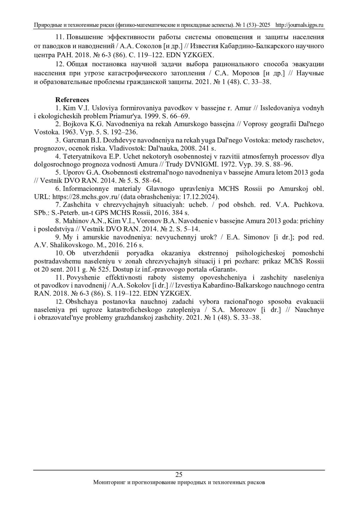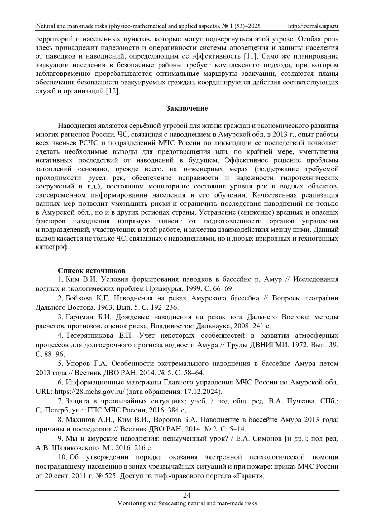 Рассмотрены причины наводнения в Амурской обл. в 2013 г. и действия органов власти, направленные на оказание помощи пострадавшему населению и организацию мер, способных ослабить негативные последствия от чрезвычайной ситуации. Рассматриваются климатические и географические факторы, способствующие возникновению паводков, включая влияние муссонных дождей и деятельность человека. Особое внимание уделено работе государственных служб, в частности МЧС России, в области ликвидации последствий наводнения, эвакуации населения и восстановления инфраструктуры. Рассматриваются меры по предотвращению подобных катастроф в будущем, включая инженерные решения, регулирование работы гидротехнических сооружений и улучшение системы информирования населения. Опыт борьбы с наводнением 2013 г. позволяет выработать эффективные стратегии для минимизации ущерба от подобных чрезвычайных ситуаций.