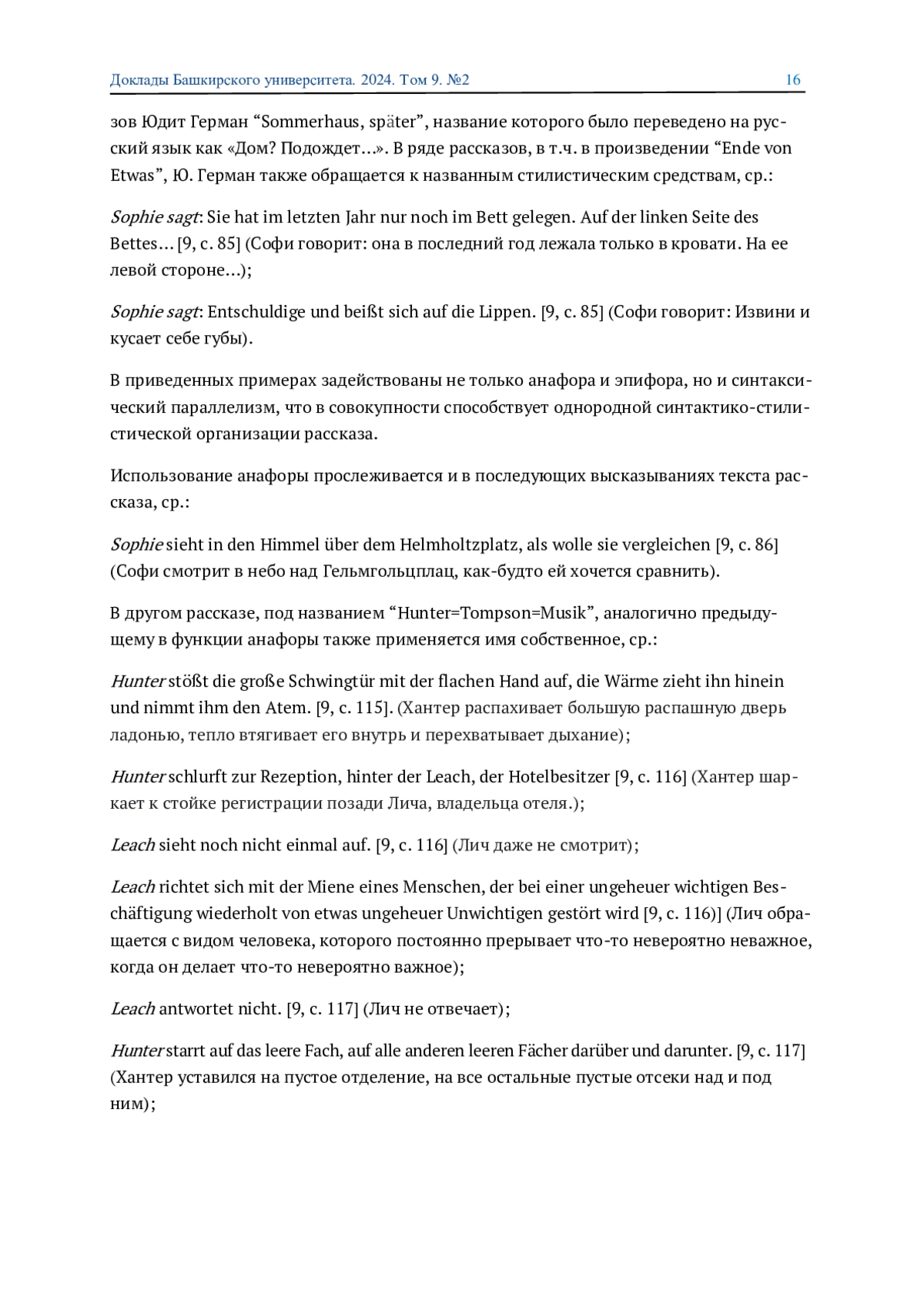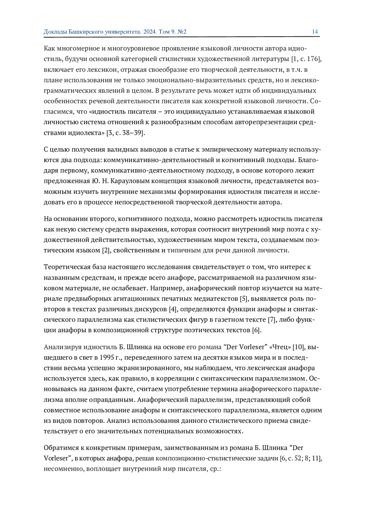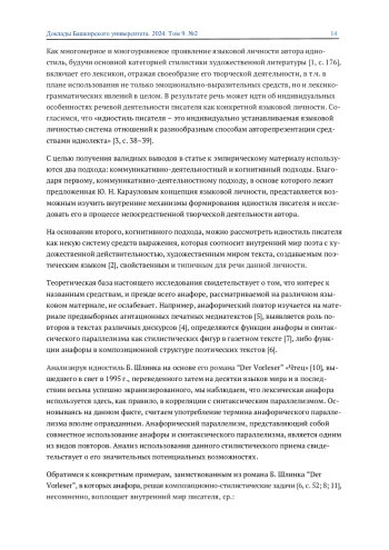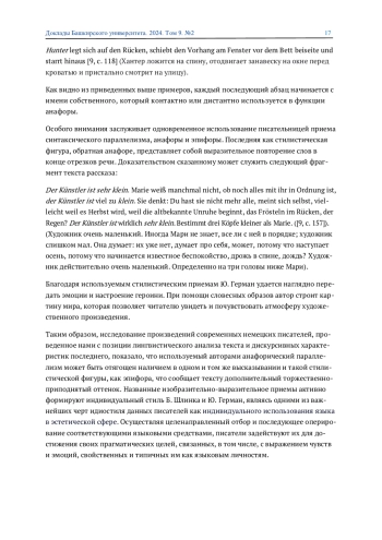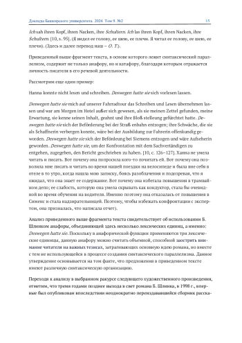 В статье анализируется использование анафоры и синтаксического параллелизма в произведениях современных немецких писателей Бернгарда Шлинка и Юдит Герман. Выявлена роль и специфика анафорического параллелизма как художественно-выразительного средства, отягощенного в ряде случаев также эпифорой, в формировании идиостиля названных авторов, исследуемые произведения которых вышли в свет в конце ХХ в. практически одновременно.
