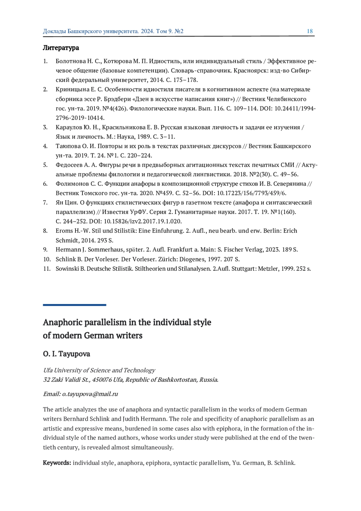 4. 	Таюпова О. И. Повторы и их роль в текстах различных дискурсов // Вестник Башкирского ун-та. 2019. Т. 24. №1. С. 220-224. EDN: ZCIEZN