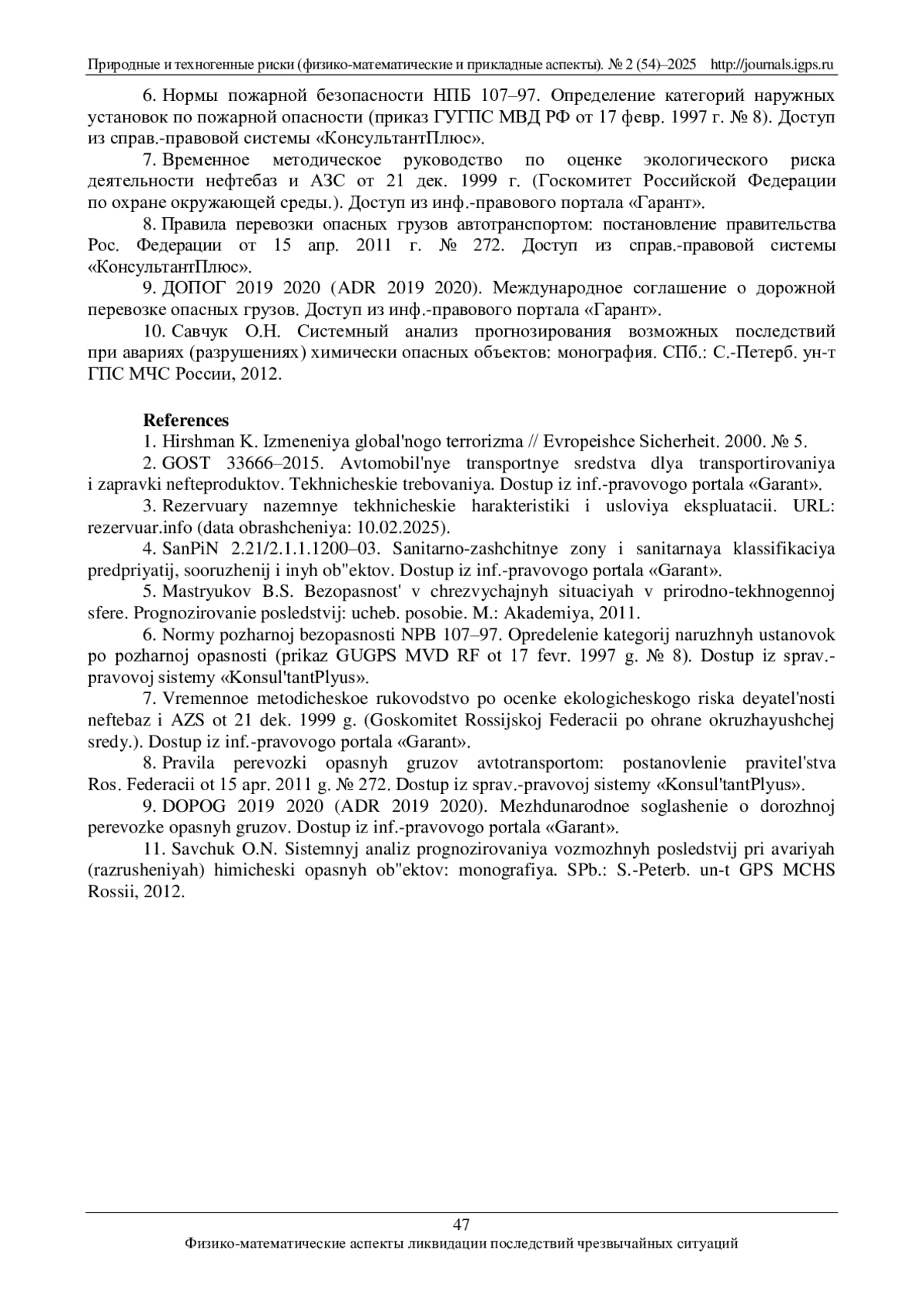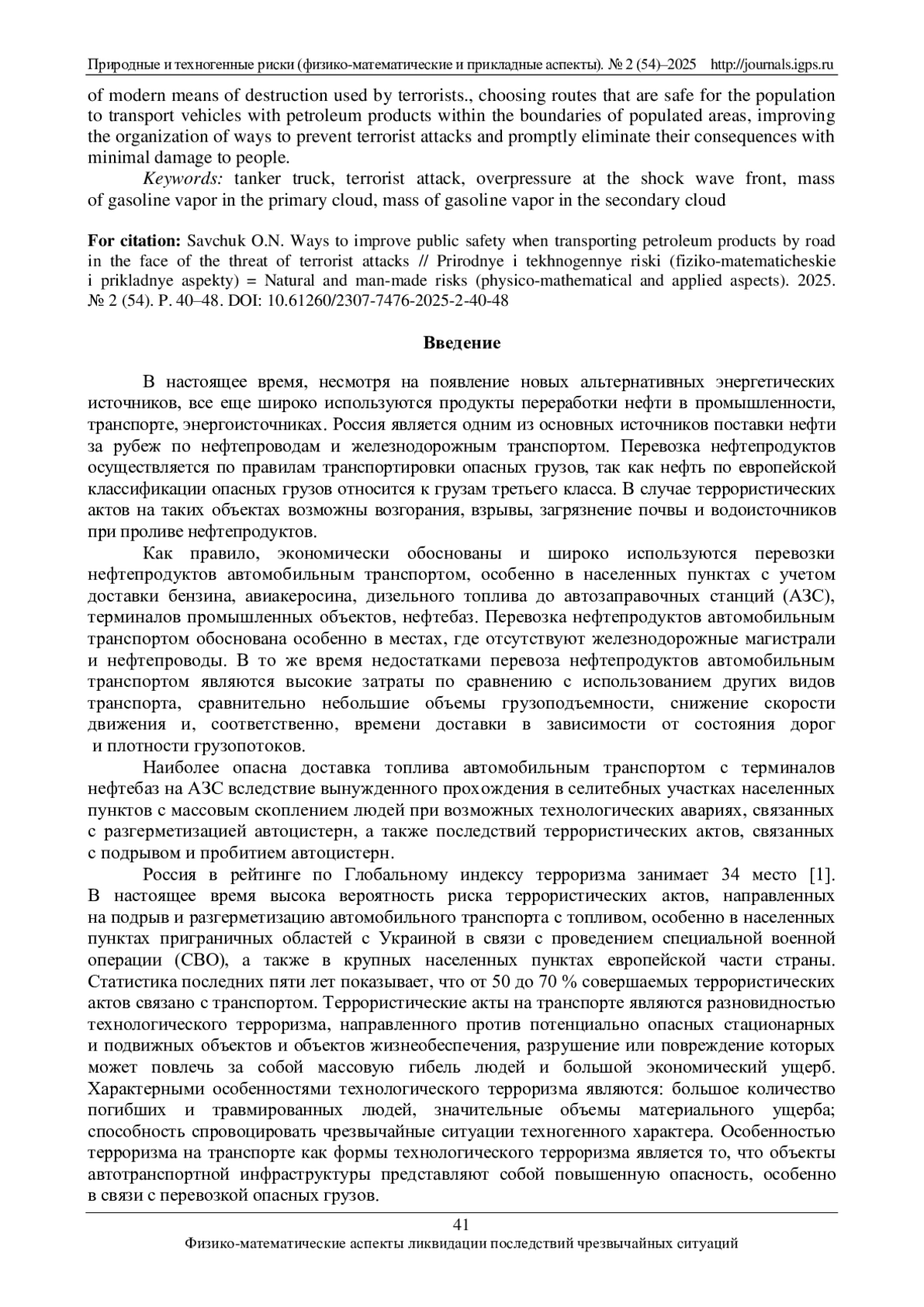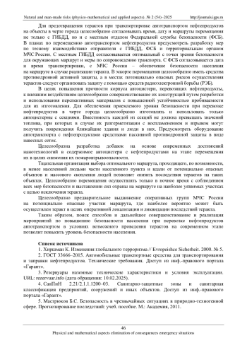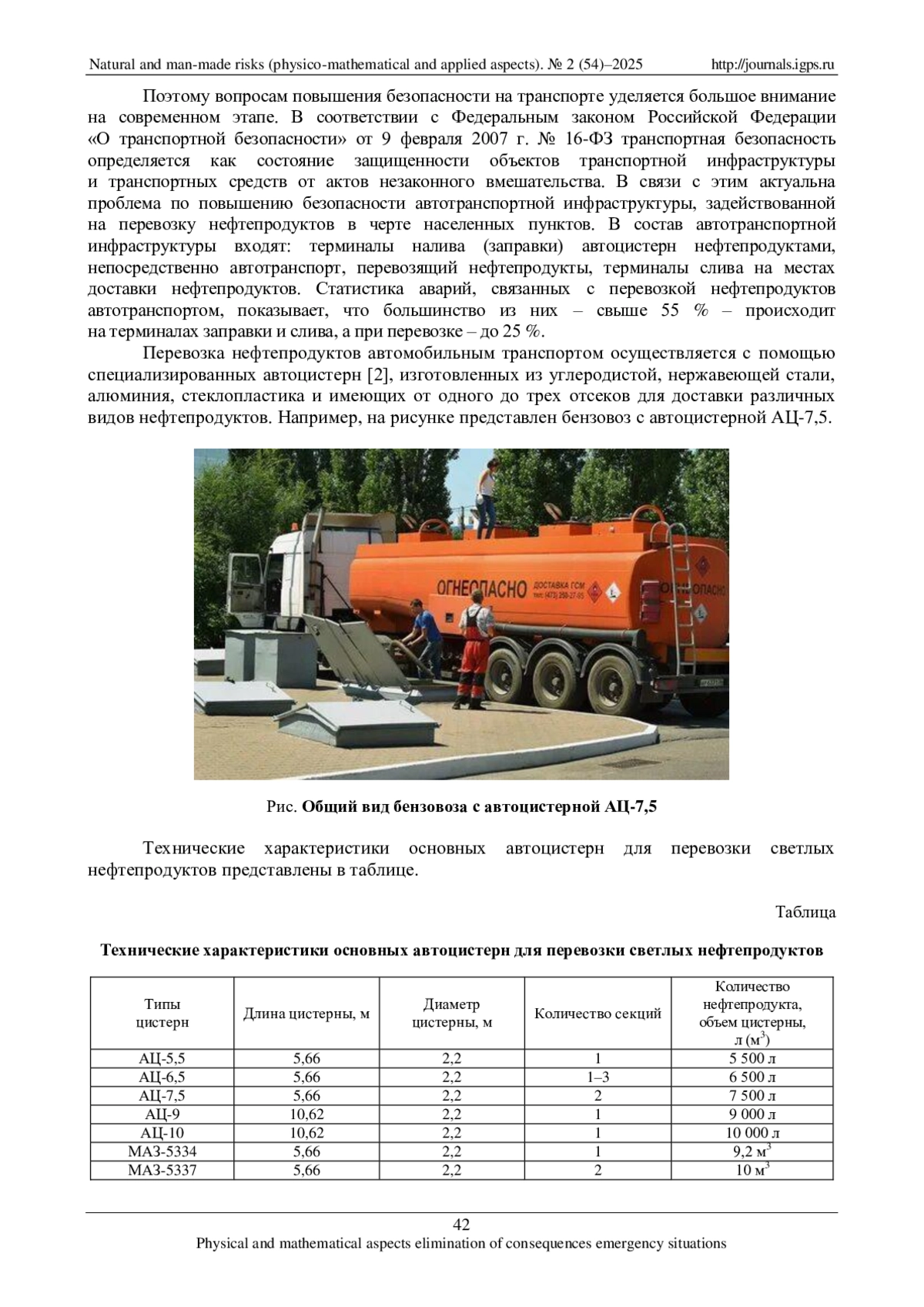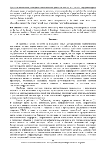 Рассматривается проблема обеспечения безопасности населения при перевозке нефтепродуктов автомобильным транспортом в населенных пунктах при осуществлении террористических актов, приведен анализ их возможных сценариев и предложены пути повышения безопасности при транспортировке путем совершенствования конструкций автоцистерн, используемых для перевозки нефтепродуктов, с повышенными прочностными характеристиками от воздействия применяемых современных средств поражения террористами, выбора безопасных для населения маршрутов перемещения автотранспорта с нефтепродуктами в черте населенных пунктов, совершенствования организации способов предотвращения терактов и оперативной ликвидации их последствий с минимальным ущербом для людей.