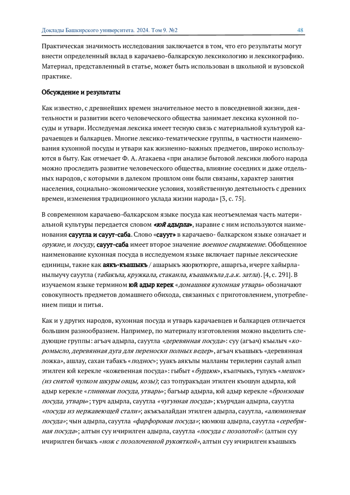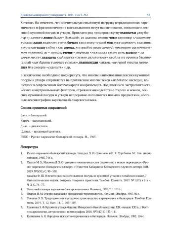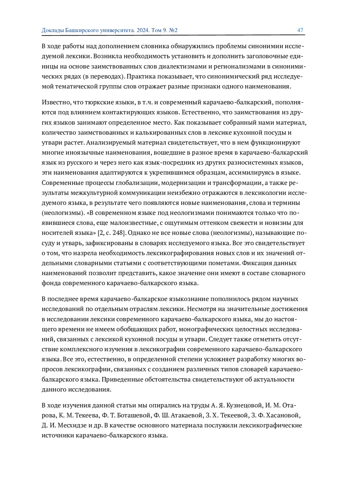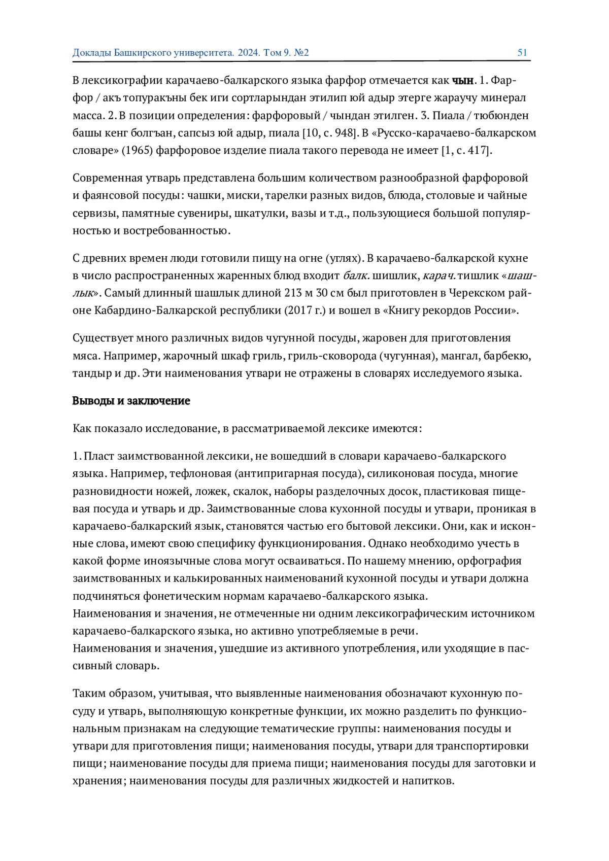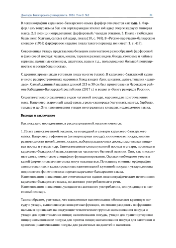 В статье впервые исследуется лексика кухонной посуды и утвари в лексикографическом аспекте. В ней показана степень отражения данной лексики в двуязычных переводных и толковом словарях карачаево-балкарского языка. Особое внимание уделяется системному описанию наименований кухонной посуды и утвари, в научный оборот вводятся новые лексические единицы, и их трактовка прежде не зафиксированные словарями карачаево-балкарского языка. Проводится классификация данной тематической группы слов в соответствии с бытовыми функциями, а также в зависимости от материала их изготовления с привлечением новых заимствованных слов. Особое внимание обращается к отражению специфики кухонной посуды и утвари в карачаево-балкарских пословицах и поговорках и фразеологизмах.