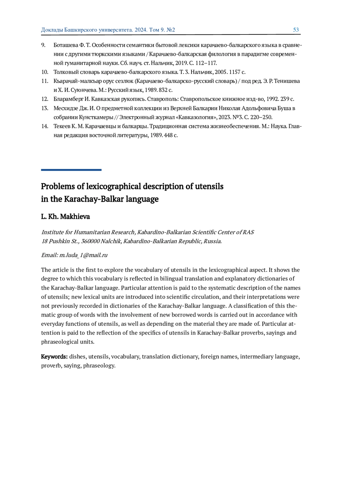 2. 	Улаков М. З., Махиева Л. Х. Отражение иноязычных слов (терминов) в новом переводном “Русско-карачаево-балкарском словаре” // Известия Кабардино-Балкарского научного центра РАН. 2019. №5(91). С. 95-100. EDN: LPKBQK