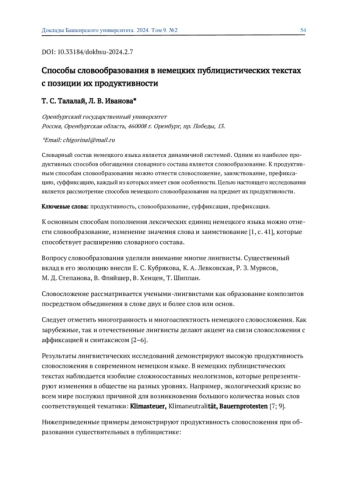 Словарный состав немецкого языка является динамичной системой. Одним из наиболее продуктивных способов обогащения словарного состава является словообразование. К продуктивным способам словообразования можно отнести словосложение, заимствование, префиксацию, суффиксацию, каждый из которых имеет свои особенности. Целью настоящего исследования является рассмотрение способов немецкого словообразования на предмет их продуктивности.