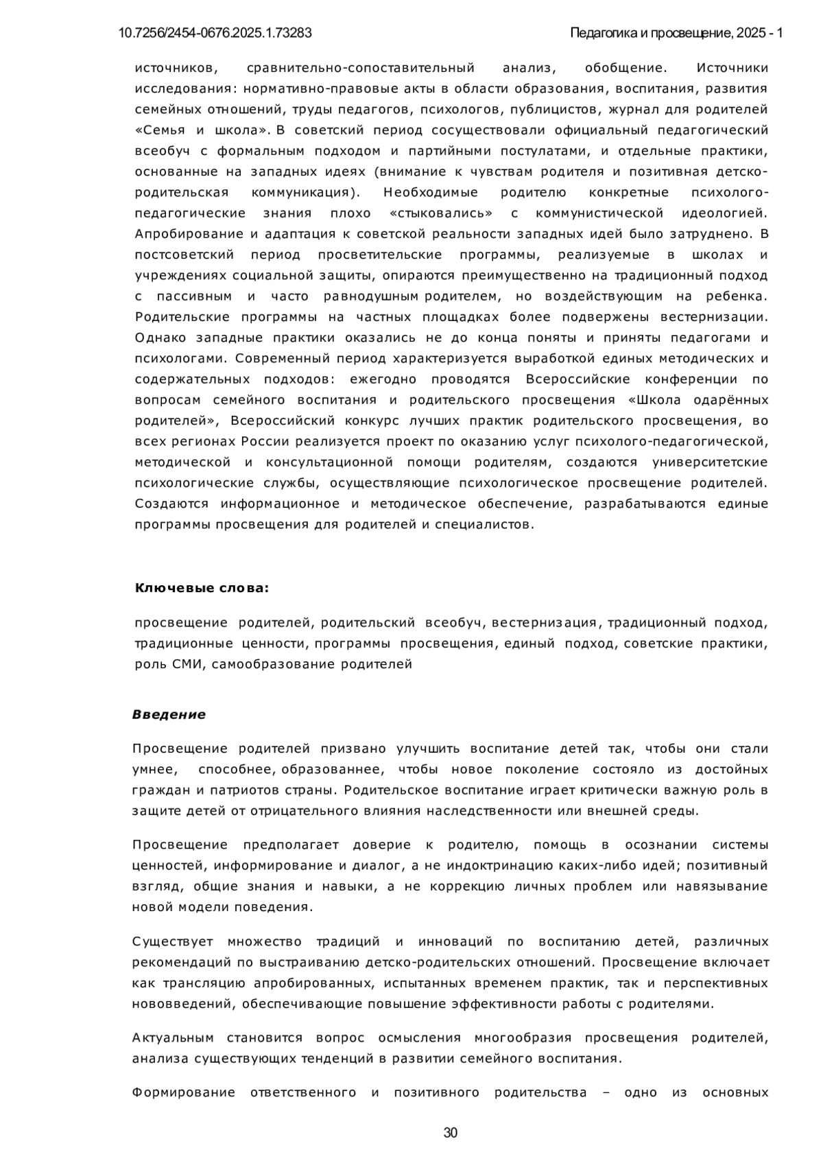 Предметом исследования является изучение педагогического просвещения родителей в России (СССР) (1980-е гг. по наст. время). Цель статьи - представить в хронологическом порядке основные педагогически значимые события и факты, выявить ключевые идеи и особенности реализации педагогического просвещения родителей в различные периоды. Выделены три периода просвещения: советский (с 1980-х - 1991 гг.), постсоветский (1992 - конец 2010-х гг.) и современный (конец 2010 гг. по наст. время). Показано, что педагогическое просвещение родителей в России прошло эволюцию от педагогического всеобуча, популяризации вестернизации, противостояния вестернизации и традиционных подходов, до приобщения к традиционным российским духовно-нравственным ценностям. Методы исследования: теоретический анализ источников, сравнительно-сопоставительный анализ, обобщение. Источники исследования: нормативно-правовые акты в области образования, воспитания, развития семейных отношений, труды педагогов, психологов, публицистов, журнал для родителей «Семья и школа». В советский период сосуществовали официальный педагогический всеобуч с формальным подходом и партийными постулатами, и отдельные практики, основанные на западных идеях (внимание к чувствам родителя и позитивная детско-родительская коммуникация). Необходимые родителю конкретные психолого-педагогические знания плохо «стыковались» с коммунистической идеологией. Апробирование и адаптация к советской реальности западных идей было затруднено. В постсоветский период просветительские программы, реализуемые в школах и учреждениях социальной защиты, опираются преимущественно на традиционный подход с пассивным и часто равнодушным родителем, но воздействующим на ребенка. Родительские программы на частных площадках более подвержены вестернизации. Однако западные практики оказались не до конца поняты и приняты педагогами и психологами. Современный период характеризуется выработкой единых методических и содержательных подходов: ежегодно проводятся Всероссийские конференции по вопросам семейного воспитания и родительского просвещения «Школа одарённых родителей», Всероссийский конкурс лучших практик родительского просвещения, во всех регионах России реализуется проект по оказанию услуг психолого-педагогической, методической и консультационной помощи родителям, создаются университетские психологические службы, осуществляющие психологическое просвещение родителей. Создаются информационное и методическое обеспечение, разрабатываются единые программы просвещения для родителей и специалистов.