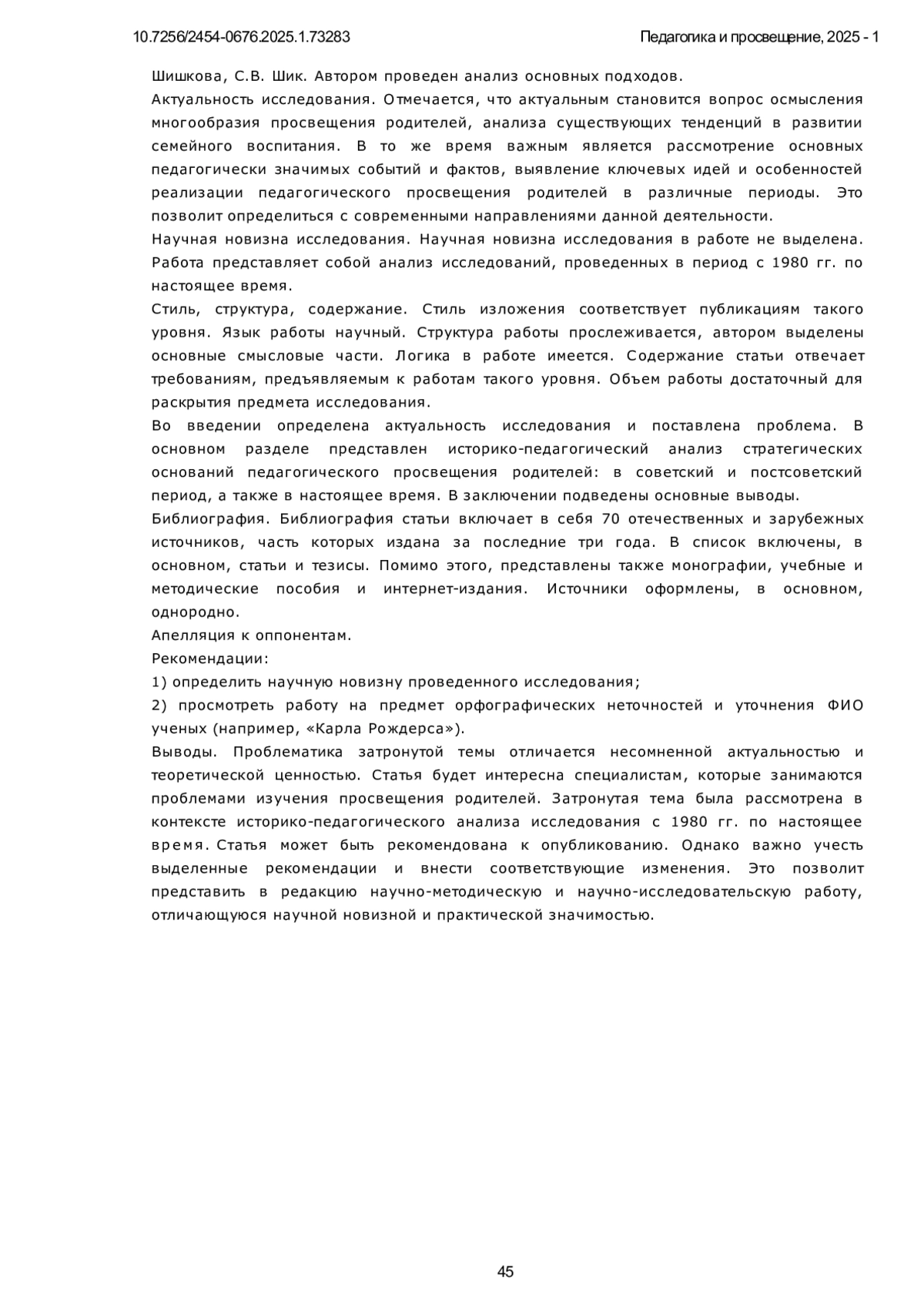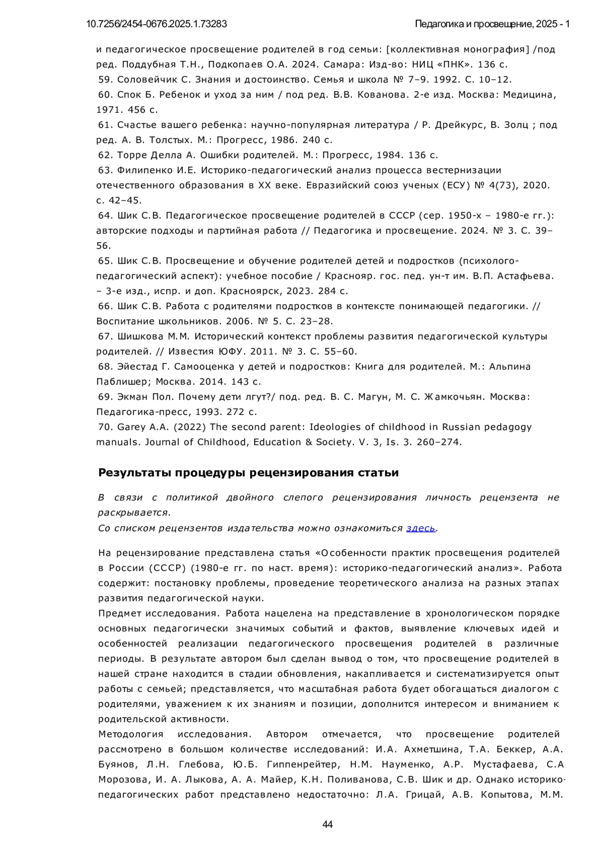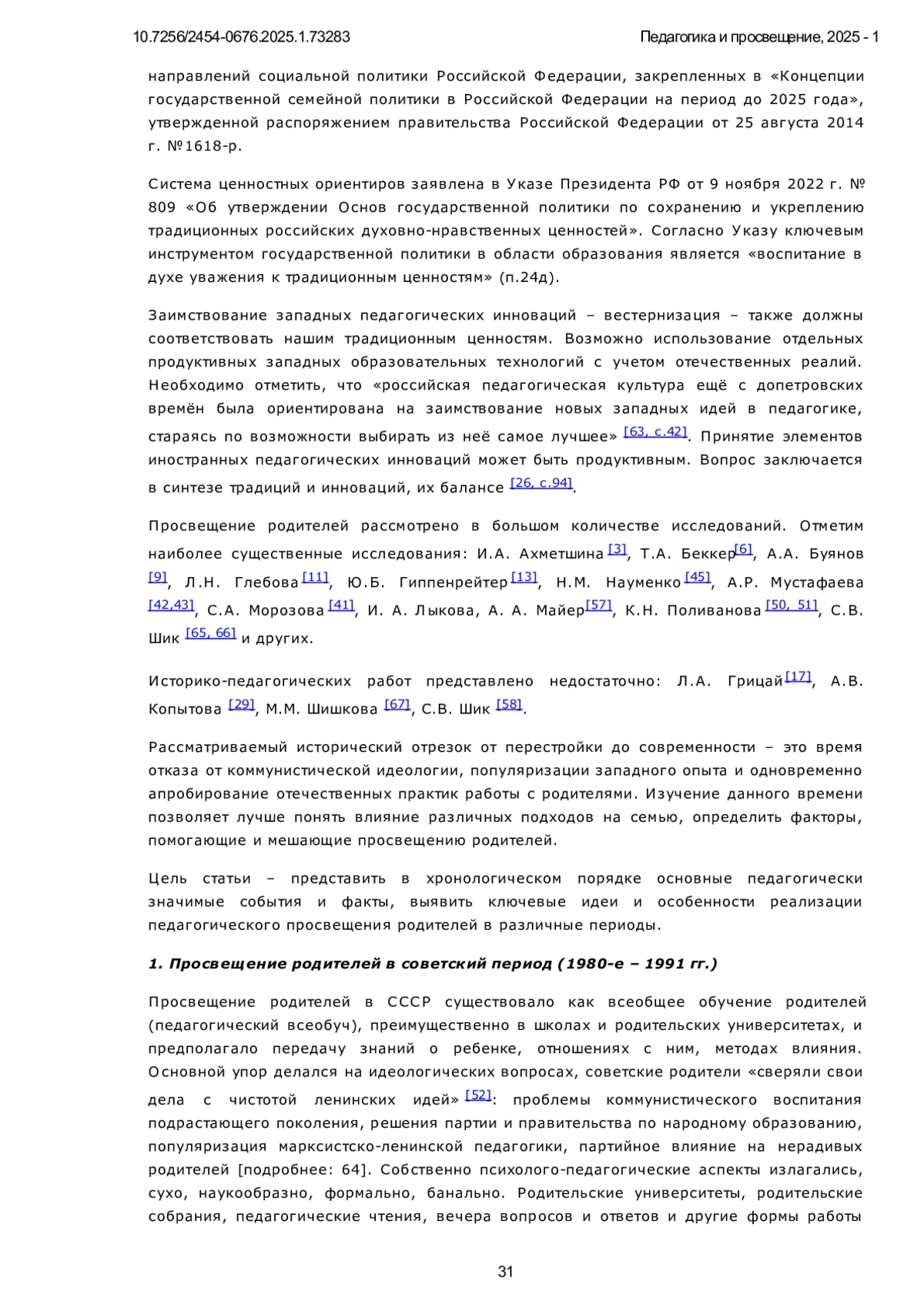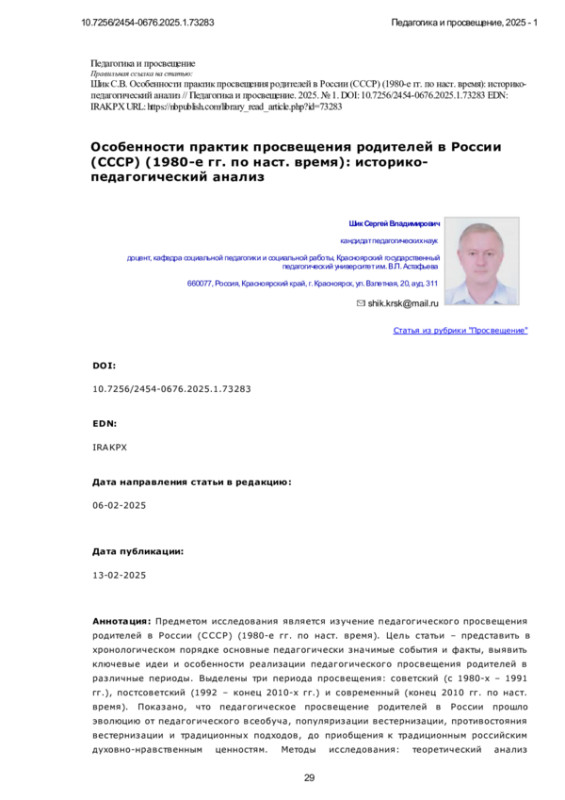64. 	Шик С.В. Педагогическое просвещение родителей в СССР (сер. 1950-х - 1980-е гг.): авторские подходы и партийная работа // Педагогика и просвещение. 2024. № 3. С. 39-56. EDN: EJFSMV