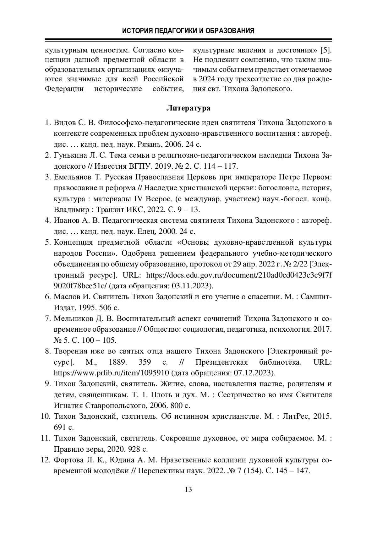 1. Видов С. В. Философско-педагогические идеи святителя Тихона Задонского в контексте современных проблем духовно-нравственного воспитания : автореф. дис. … канд. пед. наук. Рязань, 2006. 24 с.