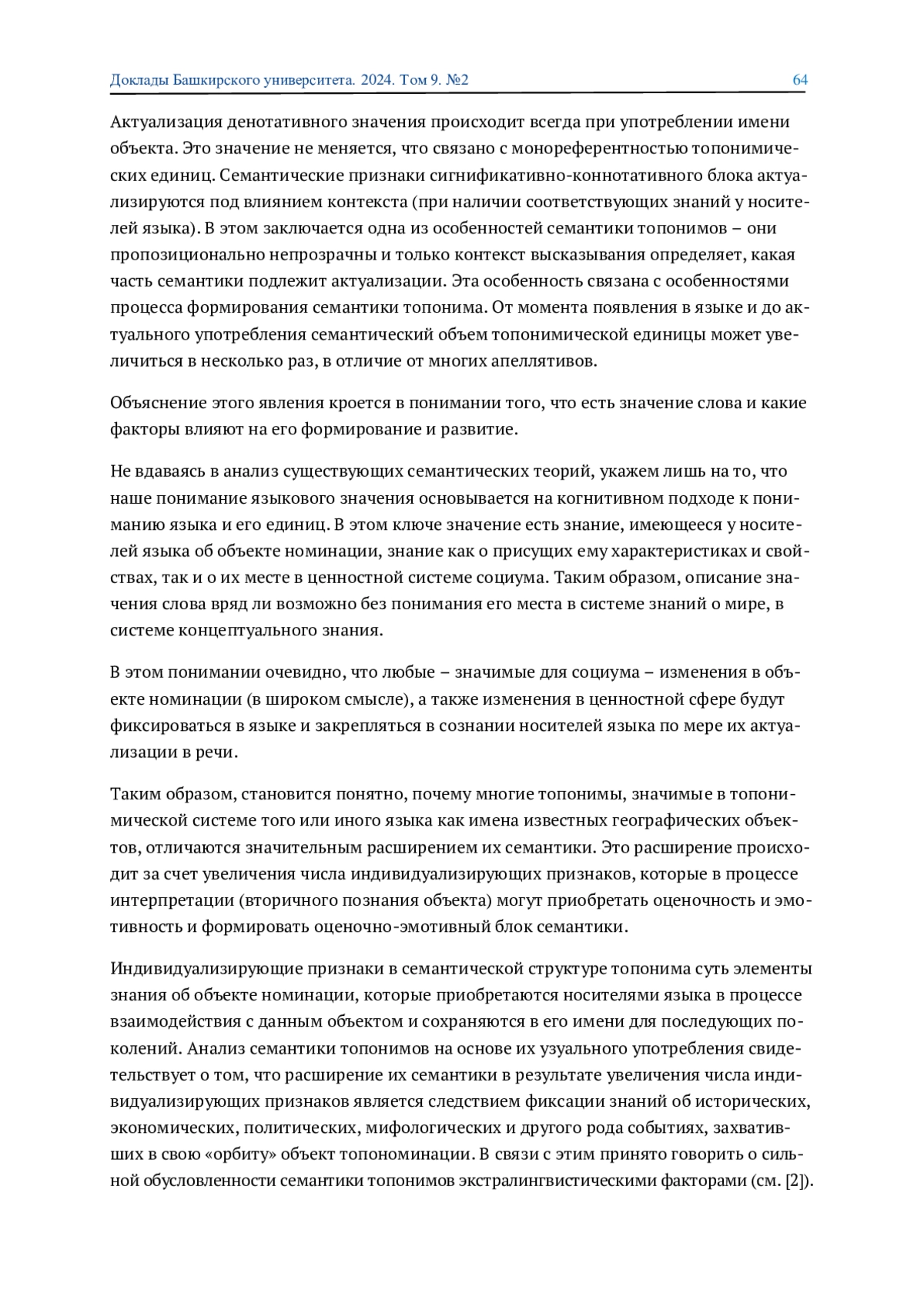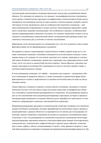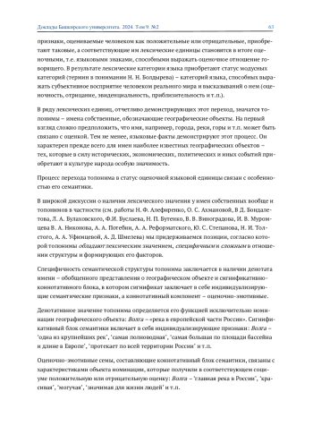 Семантика топонимов рассматривается с точки зрения когнитивного подхода к пониманию языка и определяется широко как совокупность элементов знания, имеющегося у носителей языка об объекте номинации. Специфичность топонимической семантики заключается в ее тесной обусловленности экстралингвистическими факторами, формирующими индивидуализирующие и оценочные признаки.