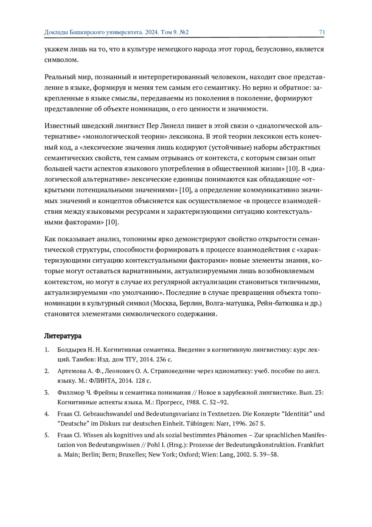 1. 	Болдырев Н. Н. Когнитивная семантика. Введение в когнитивную лингвистику: курс лекций. Тамбов: Изд. дом ТГУ, 2014. 236 с. EDN: TZCWPV