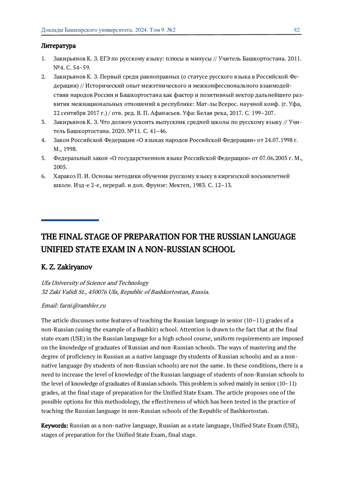 3. 	Закирьянов К. З. Что должен усвоить выпускник средней школы по русскому языку // Учитель Башкортостана. 2020. №11. С. 41-46. EDN: PFFBTB