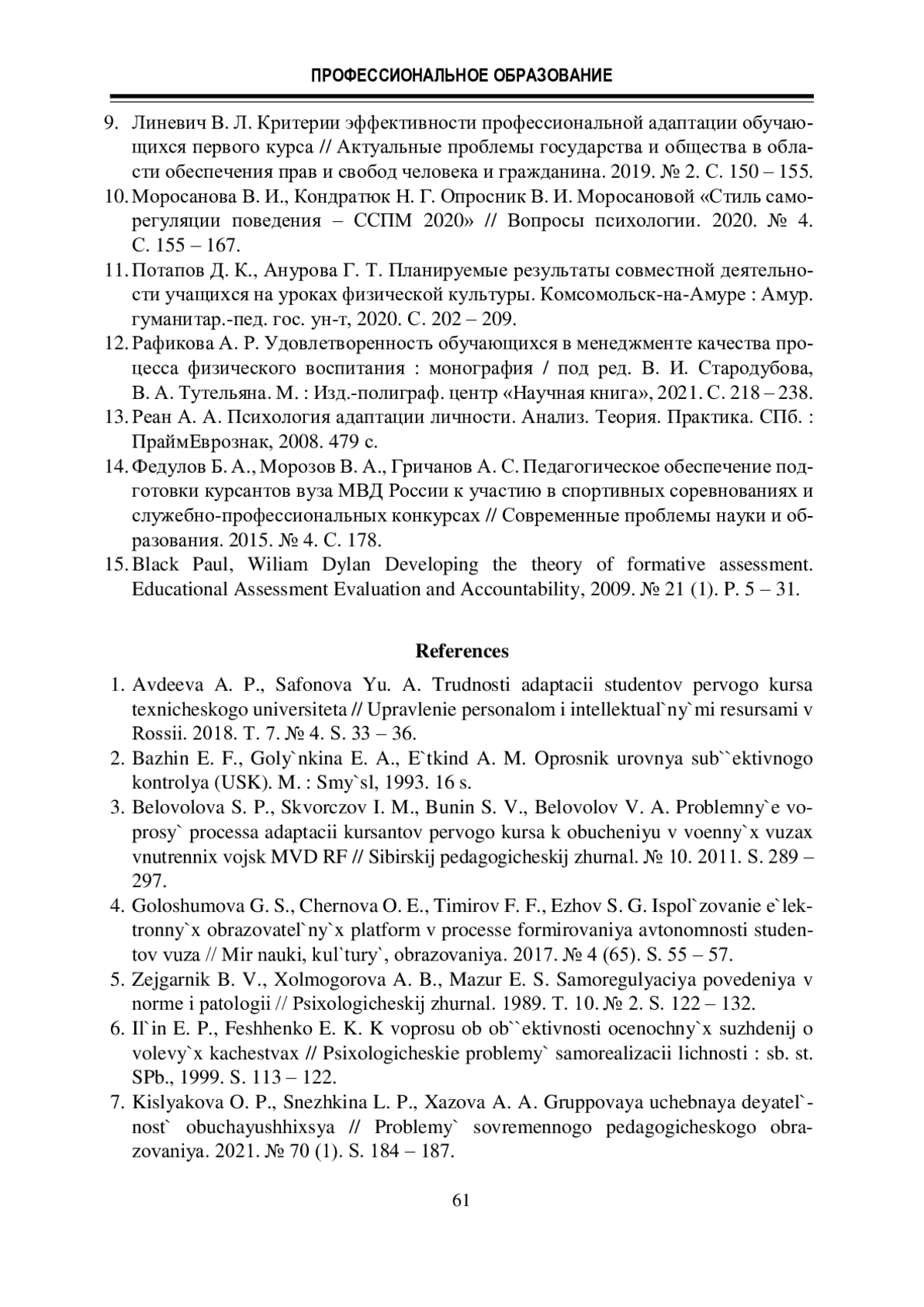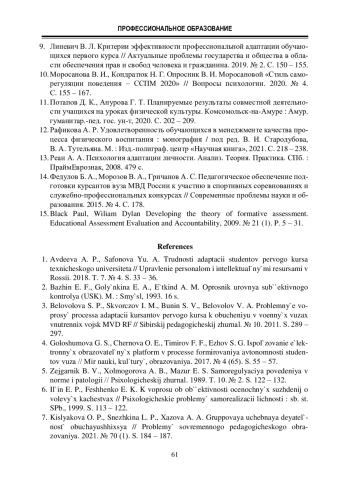 9. Линевич В. Л. Критерии эффективности профессиональной адаптации обучающихся первого курса // Актуальные проблемы государства и общества в области обеспечения прав и свобод человека и гражданина. 2019. № 2. С. 150 - 155.