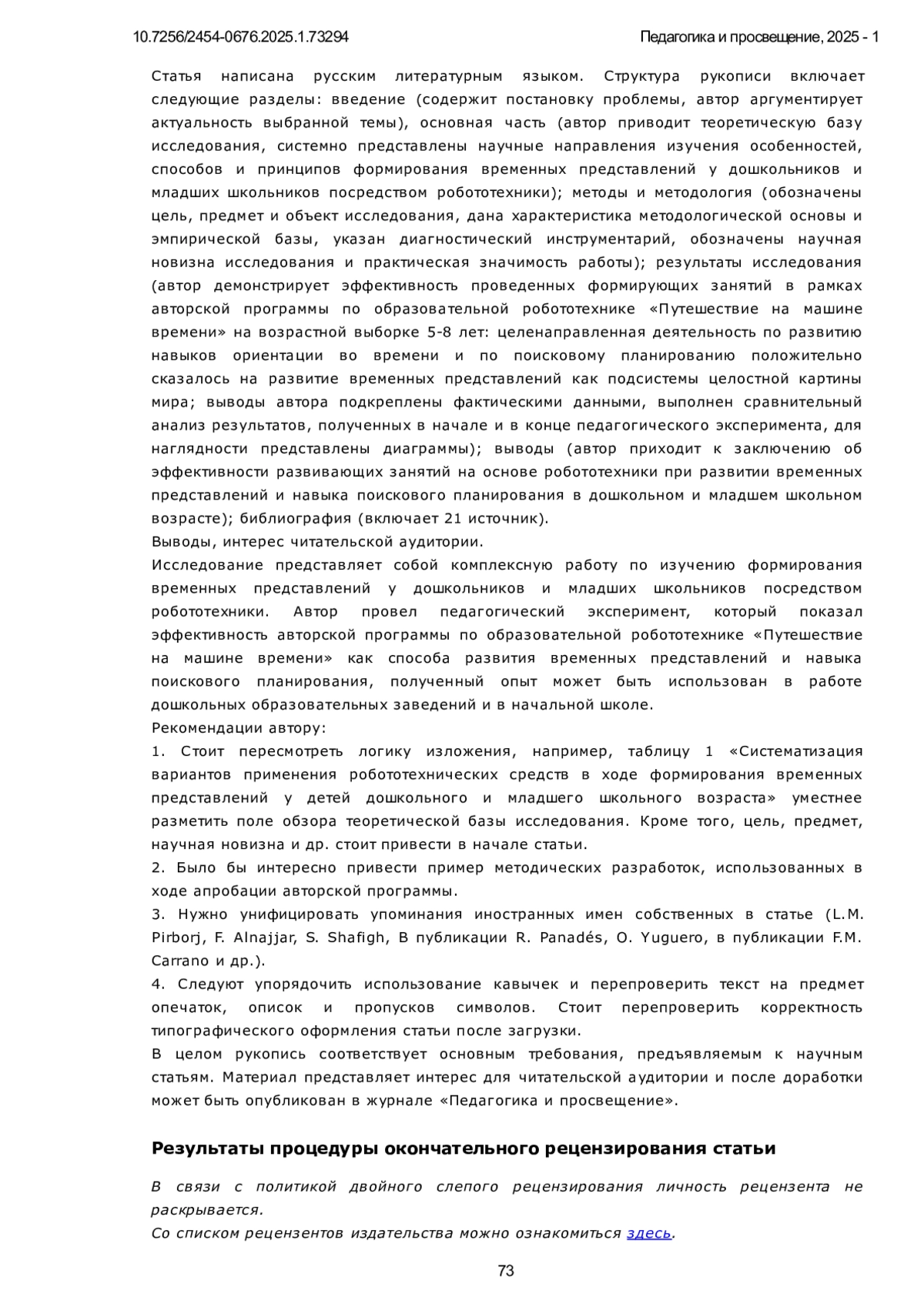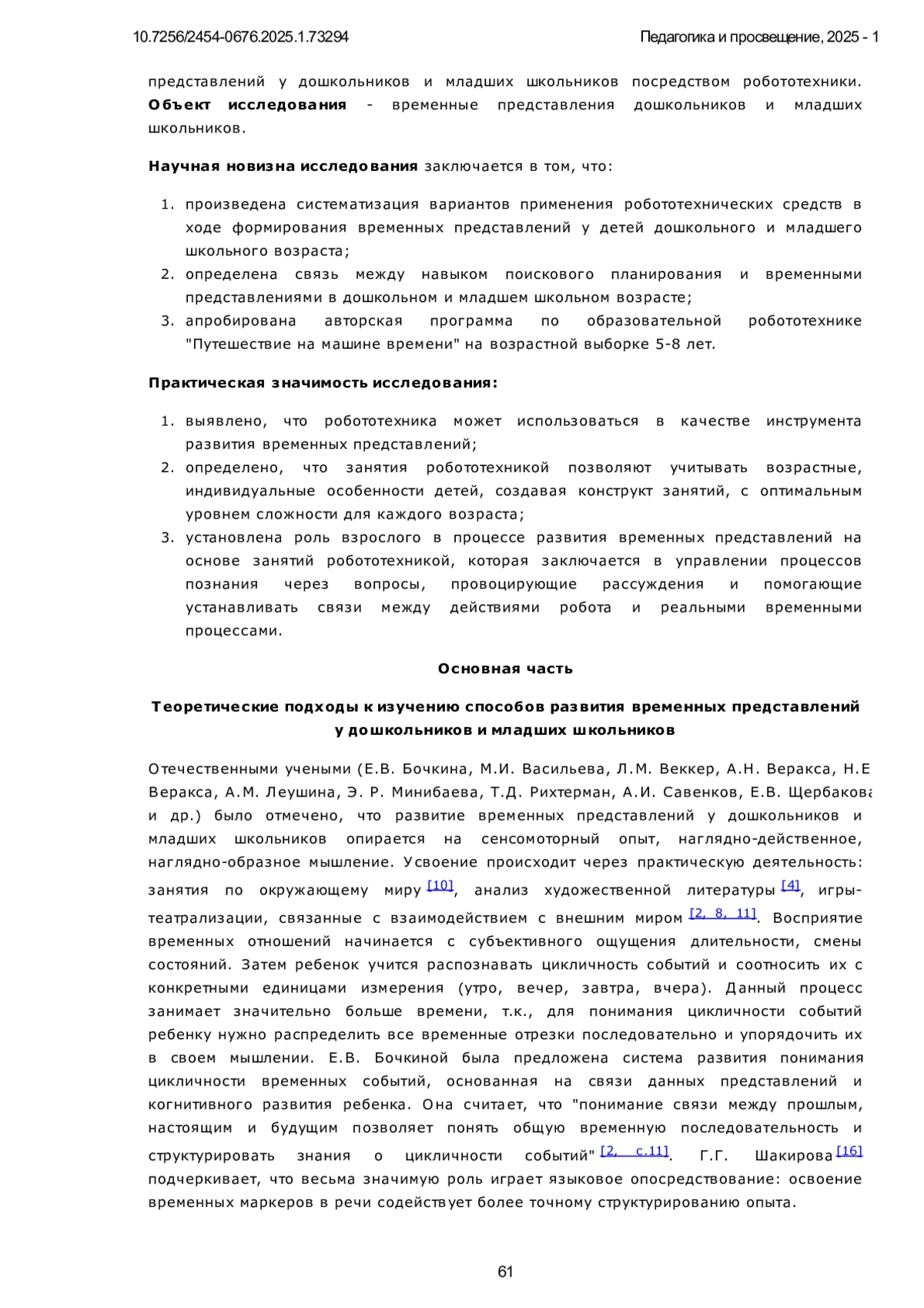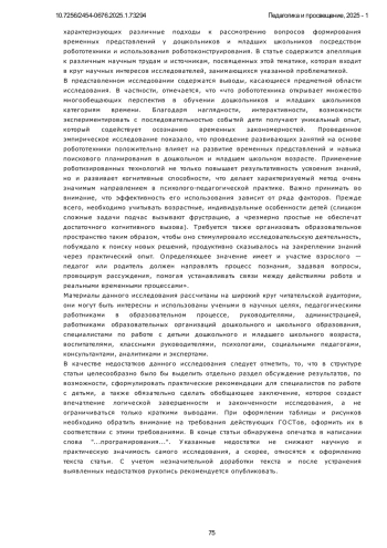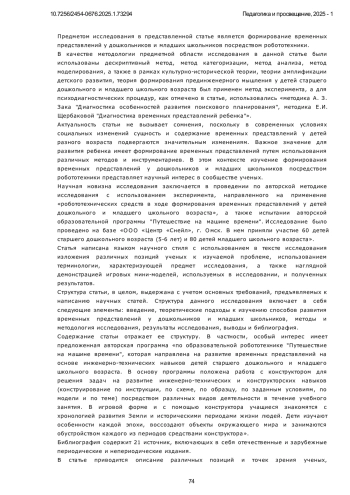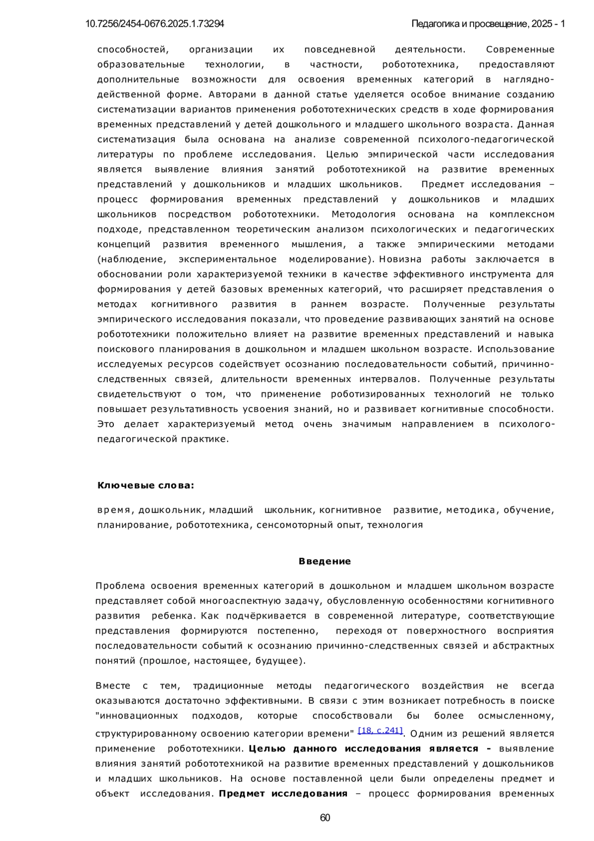 Актуальность исследования обусловлена необходимостью совершенствования методов формирования временных представлений у дошкольников и младших школьников, что играет фундаментальную роль в развитии когнитивных способностей, организации их повседневной деятельности. Современные образовательные технологии, в частности, робототехника, предоставляют дополнительные возможности для освоения временных категорий в наглядно-действенной форме. Авторами в данной статье уделяется особое внимание созданию систематизации вариантов применения робототехнических средств в ходе формирования временных представлений у детей дошкольного и младшего школьного возраста. Данная систематизация была основана на анализе современной психолого-педагогической литературы по проблеме исследования. Целью эмпирической части исследования является выявление влияния занятий робототехникой на развитие временных представлений у дошкольников и младших школьников. Предмет исследования - процесс формирования временных представлений у дошкольников и младших школьников посредством робототехники. Методология основана на комплексном подходе, представленном теоретическим анализом психологических и педагогических концепций развития временного мышления, а также эмпирическими методами (наблюдение, экспериментальное моделирование). Новизна работы заключается в обосновании роли характеризуемой техники в качестве эффективного инструмента для формирования у детей базовых временных категорий, что расширяет представления о методах когнитивного развития в раннем возрасте. Полученные результаты эмпирического исследования показали, что проведение развивающих занятий на основе робототехники положительно влияет на развитие временных представлений и навыка поискового планирования в дошкольном и младшем школьном возрасте. Использование исследуемых ресурсов содействует осознанию последовательности событий, причинно-следственных связей, длительности временных интервалов. Полученные результаты свидетельствуют о том, что применение роботизированных технологий не только повышает результативность усвоения знаний, но и развивает когнитивные способности. Это делает характеризуемый метод очень значимым направлением в психолого-педагогической практике.