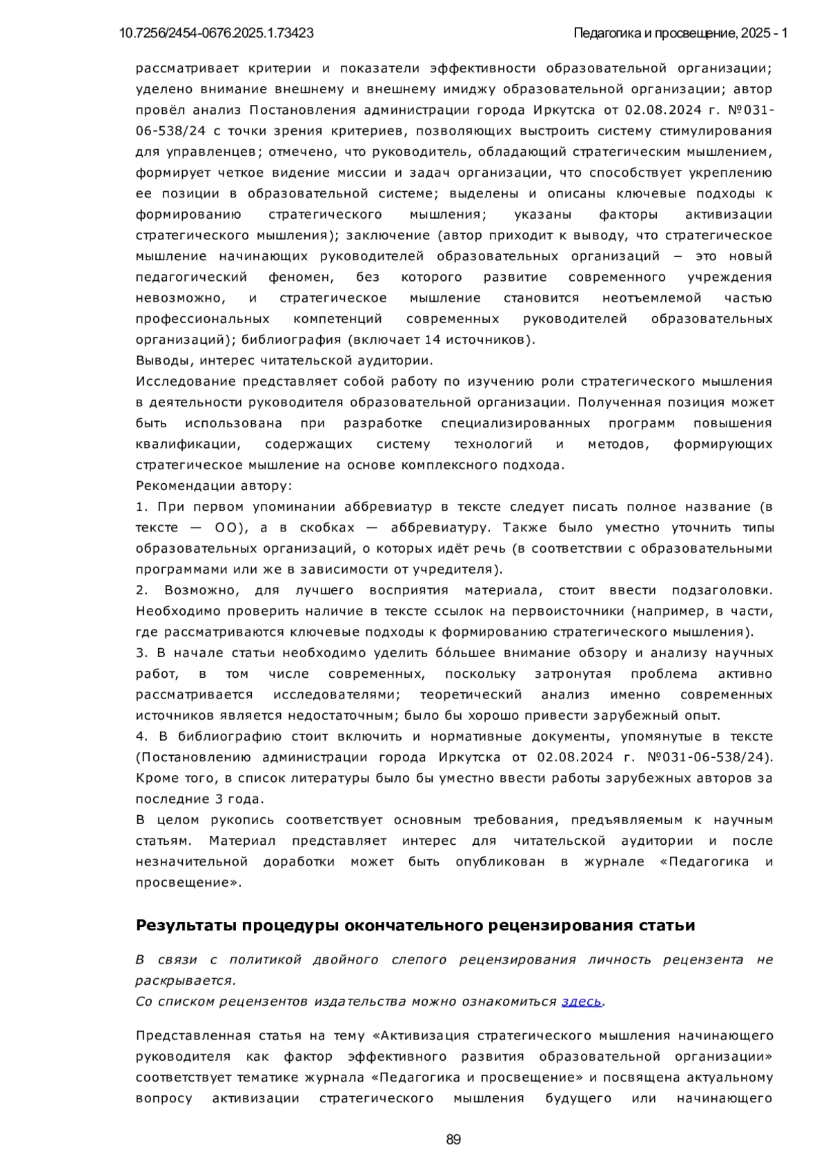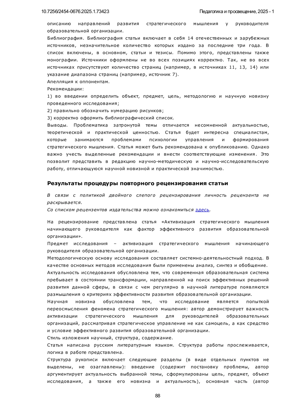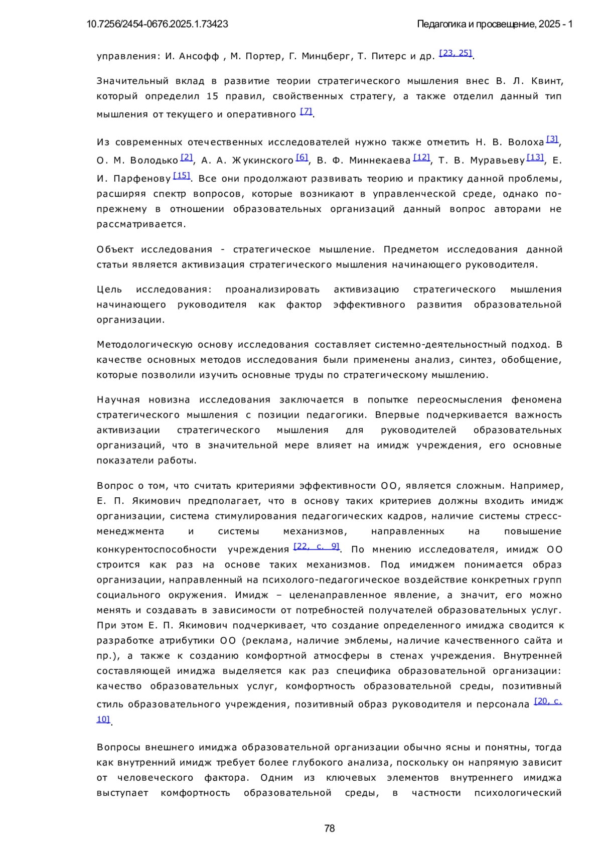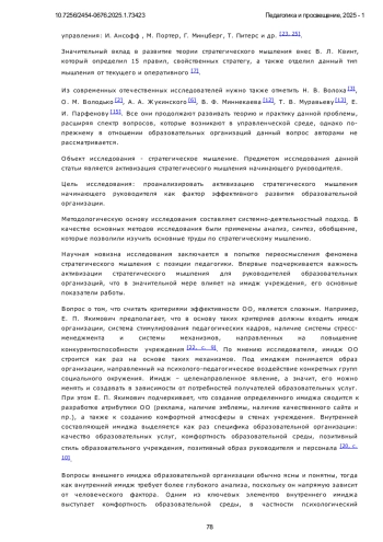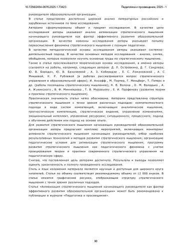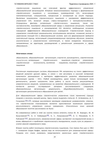 Статья посвящена проблеме активизации стратегического мышления начинающего руководителя образовательной организации. Основным предметом изучения стало стратегическое мышление как педагогический феномен, влияющий на развитие образовательного учреждения. Подробно рассмотрен вопрос о структуре стратегического мышления. Отмечено, что каждому руководителю необходимо формирование стратегической осознанности, являющейся основой для принятия решений по управлению образовательным учреждением. В качестве методологической основы исследования избран системно-деятельностный подход. Для изучения вопроса трансформации стратегического мышления автором использованы общенаучный методы познания: анализ, синтез, обобщение, индукция. Настоящее исследование раскрывает стратегическое мышление как ключевой фактор эффективного управления образовательной организацией. Впервые проанализированы подходы к формированию стратегического мышления у начинающих руководителей ОО, включающие компетентностный, ситуационный, процессный и основанный на опыте подходы. Выявлена взаимосвязь стратегического мышления с критериями эффективности управления ОО, включая имидж, стресс-менеджмент и конкурентоспособность. Определены факторы активизации стратегического мышления, такие как наставничество, мониторинг образовательной среды и управление ресурсами. Развитие стратегического мышления у руководителей ОО является необходимым условием повышения эффективности образовательных учреждений. Стратегический подход в управлении способствует рациональному использованию ресурсов, снижению рисков и укреплению позиций ОО в образовательной системе. Для его формирования требуется комплексный подход, включающий специализированные программы обучения, развитие аналитических и управленческих компетенций, а также внедрение механизмов, направленных на адаптацию руководителей к динамичным изменениям в сфере образования.
