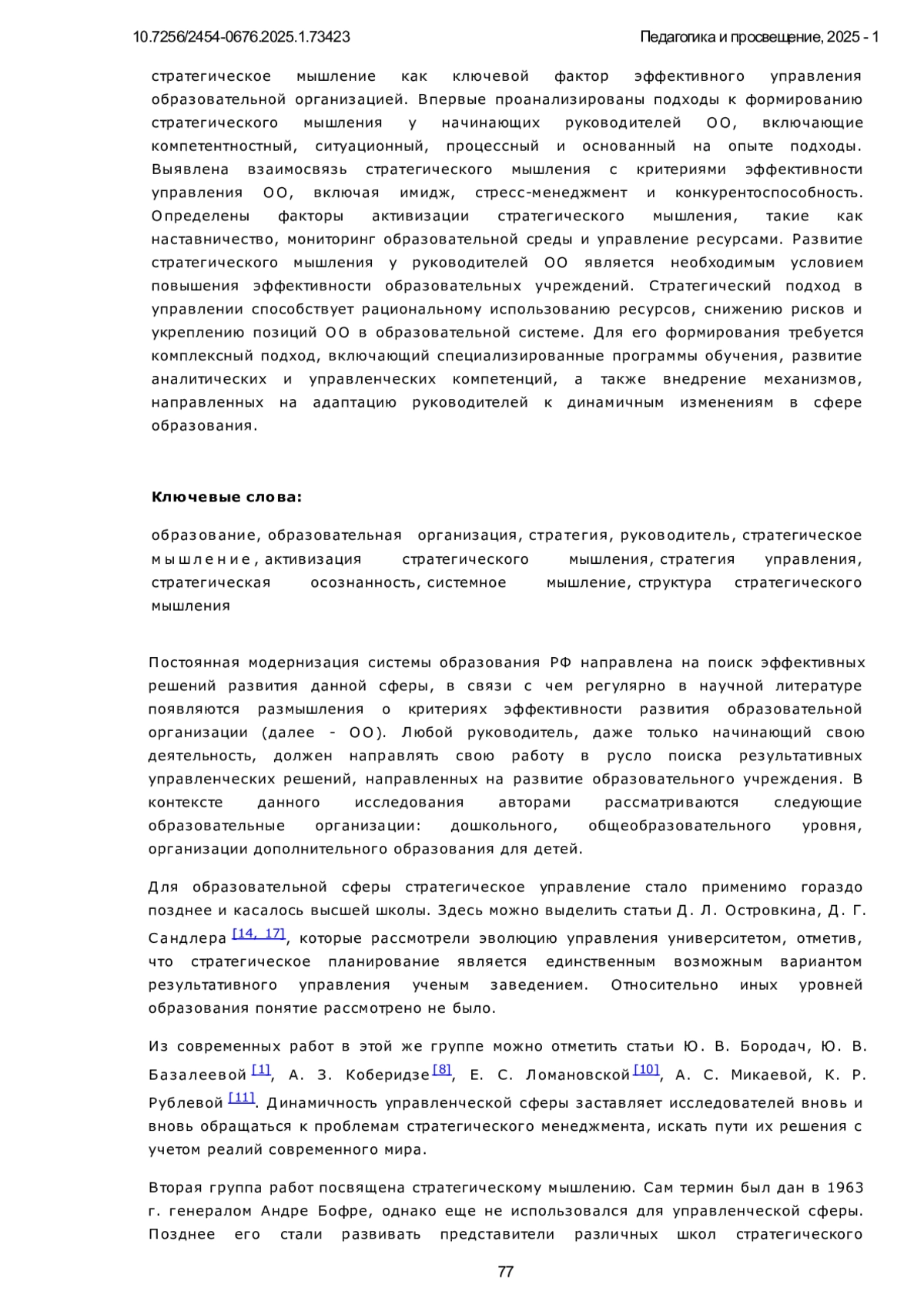 18. 	Стрекалова Н. Д. Стратегическое мышление менеджеров: сущность, проблемы и подходы к развитию // Вестник Санкт-Петербургского университета. Менеджмент. 2018. № 3. C. 230 - 238.