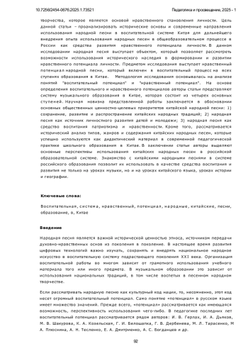 Актуальность настоящего исследования обусловлена необходимостью формирования нравственного потенциала у молодого поколения XXI века. В настоящее время существует ряд проблем в использовании культурного наследия народного творчества, которое является основой нравственного становления личности. Цель данной статьи - проанализировать исторические основы и современные направления использования народной песни в воспитательной системе Китая для дальнейшего внедрения опыта использования народных песен в общеобразовательном процессе в России как средства развития нравственного потенциала личности. В данном исследовании народная песня выступает объектом, который позволяет рассмотреть возможности использования исторического наследия в формировании и развитии нравственного потенциала личности. Предметом исследования выступает нравственный потенциал народной песни, который включен в воспитательный процесс на всех ступенях образования в Китае. Методология исследования основывалась на анализе понятий “воспитательный потенциал” и “нравственный потенциал”. На основе определения воспитательного и нравственного потенциалов авторы статьи представляют систему музыкального образования в Китае, которая состоит из четырех основных ступеней. Научная новизна представленной работы заключается в обосновании основных общественных ценностно-целевых приоритетов китайской народной песни: 1) сохранение, развитие и распространение китайских народных традиций; 2) народная песня как источник личностного развития детей и молодежи; 3) народная песня как средство воспитания патриотизма и нравственности. Кроме того, рассматривается исторический анализ типов, жанров и содержания китайских народных песен, которые успешно используются как дидактический материал в современной педагогической практике школьного образования в Китае. В заключении статьи авторы выделяют основные перспективы использования китайских народных песен в российской образовательной системе. Знакомство с китайскими народными песнями в системе российского образования позволит их использовать в качестве средства воспитания и развития не только на уроках музыки, но и на уроках китайского языка, уроках истории и географии.