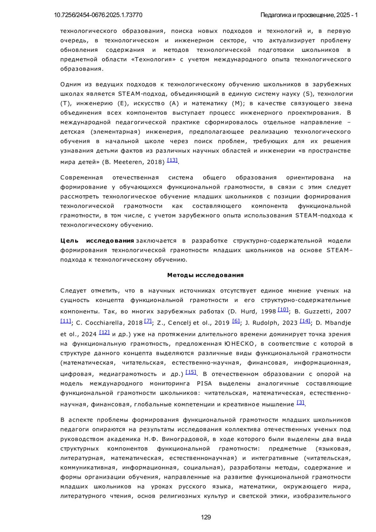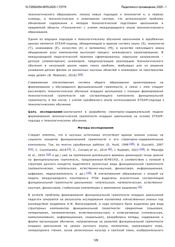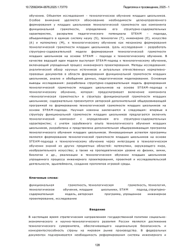 Предметом исследования является процесс формирования технологической грамотности младших школьников на основе STEAM - подхода к технологическому обучению. Объектом исследования - технологическое обучение младших школьников. Особое внимание уделяется обоснованию необходимости целенаправленного формирования у младших школьников технологической грамотности как компонента функциональной грамотности, определению его структурно-содержательных характеристик, раскрытию педагогического потенциала STEAM - подхода, объединяющего в единую систему науку (S), технологии (T), инженерию (E), искусство (A) и математику (M), к технологическому обучению как механизма формирования технологической грамотности младших школьников. Цель исследования - разработать структурно-содержательной модели формирования технологической грамотности младших школьников на основе STEAM - подхода к технологическому обучению. В качестве ведущей идеи модели выступает STEAM-подход к технологическому обучению, включающий упрощенный процесс инженерного проектирования. Методы исследования: аналитический обзор научных источников и актуальных отечественных нормативно-правовых документов в области формирования функциональной грамотности младших школьников, анализ и обобщение данных, педагогическое моделирование. Основные выводы исследования: разработана структурно-содержательная модель формирования технологической грамотности младших школьников на основе STEAM-подхода к технологическому обучению, которая: предусматривает включение компонента «технологическая грамотность» в структуру функциональной грамотности младших школьников; содержательно презентуется авторской дополнительной общеразвивающей программой по формированию технологической грамотности младших школьников на основе STEAM-подхода. Научная новизна заключается в следующем: впервые в структуру функциональной грамотности младших школьников предлагается включить технологический компонент с определением его структурно-содержательных характеристик; с учетом зарубежного опыта технологического обучения младших школьников, разработана и представлена дополнительная общеразвивающая программа технологического обучения младших школьников. Инновационным аспектом программы является формирование технологической грамотности младших школьников на основе STEAM-подхода к технологическому обучению через интеграцию в технологическом обучении знаний из других предметных областей: математики, окружающего мира, изобразительного искусства; а также на пропедевтическом уровне из физики, химии, биологии и др., реализации в технологическом обучении младших школьников упрощенного процесса инженерного проектирования, проектной и исследовательской деятельности, эдьютеймента, создание прототипов игровой среды.