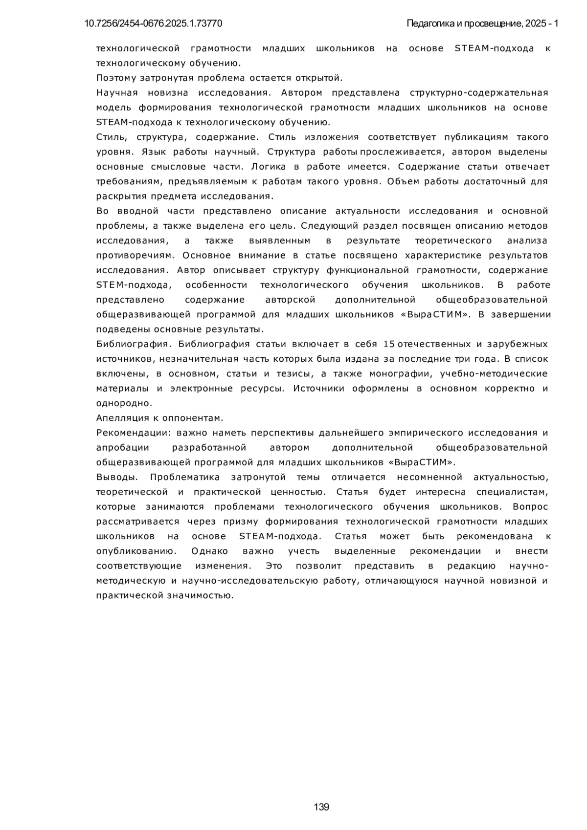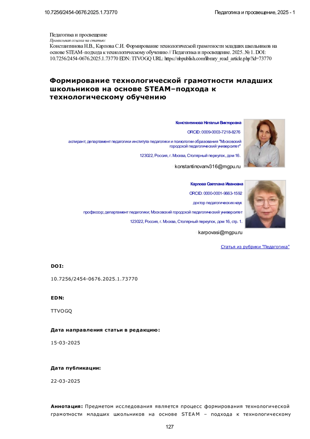 1. 	Константинова Н.В. STEAM-подход к технологическому обучению в младшей школе: возможности и ограничения // Современная наука, актуальные вопросы науки и образования. Серия: Гуманитарные науки. 2024. № 11-2. С. 91-95.