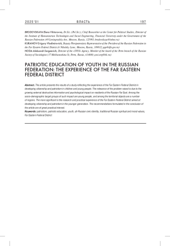 В статье представлены результаты исследования, отражающего опыт Дальневосточного федерального округа по формированию гражданственности и патриотизма у детей и молодежи. Актуальность затронутой проблемы обусловлена нарастающим внешним деструктивным информационно-психологическим воздействием на жителей российского Дальнего Востока. Среди социально-демографических групп-мишеней такого воздействия - молодежь, среди территориальных объектов - ряд конкретных территорий. В этих условиях исследовательский и практический опыт ДФО, направленный на формирование гражданственности и патриотизма молодого поколения, приобретает особое значение.