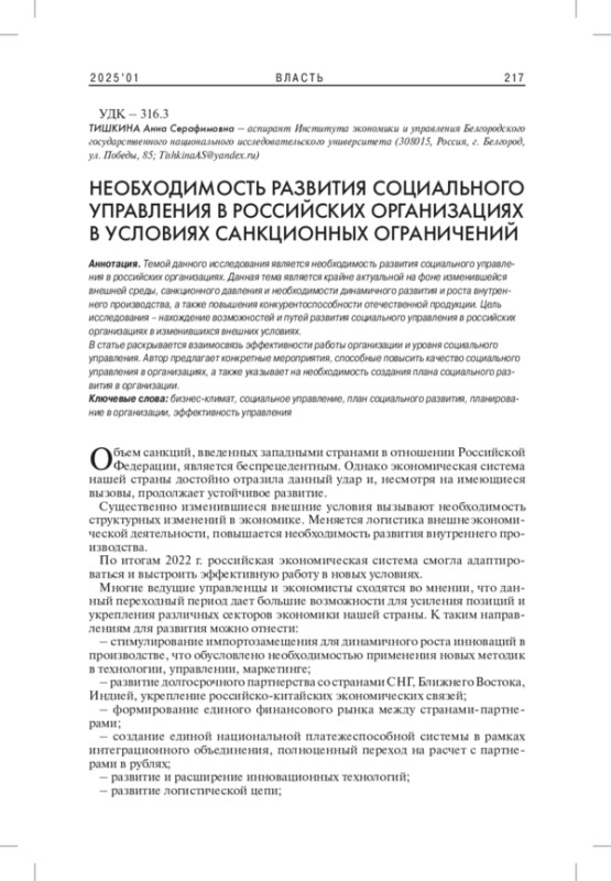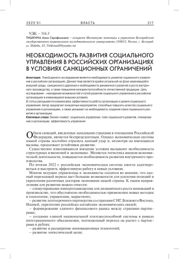 Темой данного исследования является необходимость развития социального управления в российских организациях. Данная тема является крайне актуальной на фоне изменившейся внешней среды, санкционного давления и необходимости динамичного развития и роста внутреннего производства, а также повышения конкурентоспособности отечественной продукции. Цель исследования - нахождение возможностей и путей развития социального управления в российских организациях в изменившихся внешних условиях. В статье раскрывается взаимосвязь эффективности работы организации и уровня социального управления. Автор предлагает конкретные мероприятия, способные повысить качество социального управления в организациях, а также указывает на необходимость создания плана социального развития в организации.