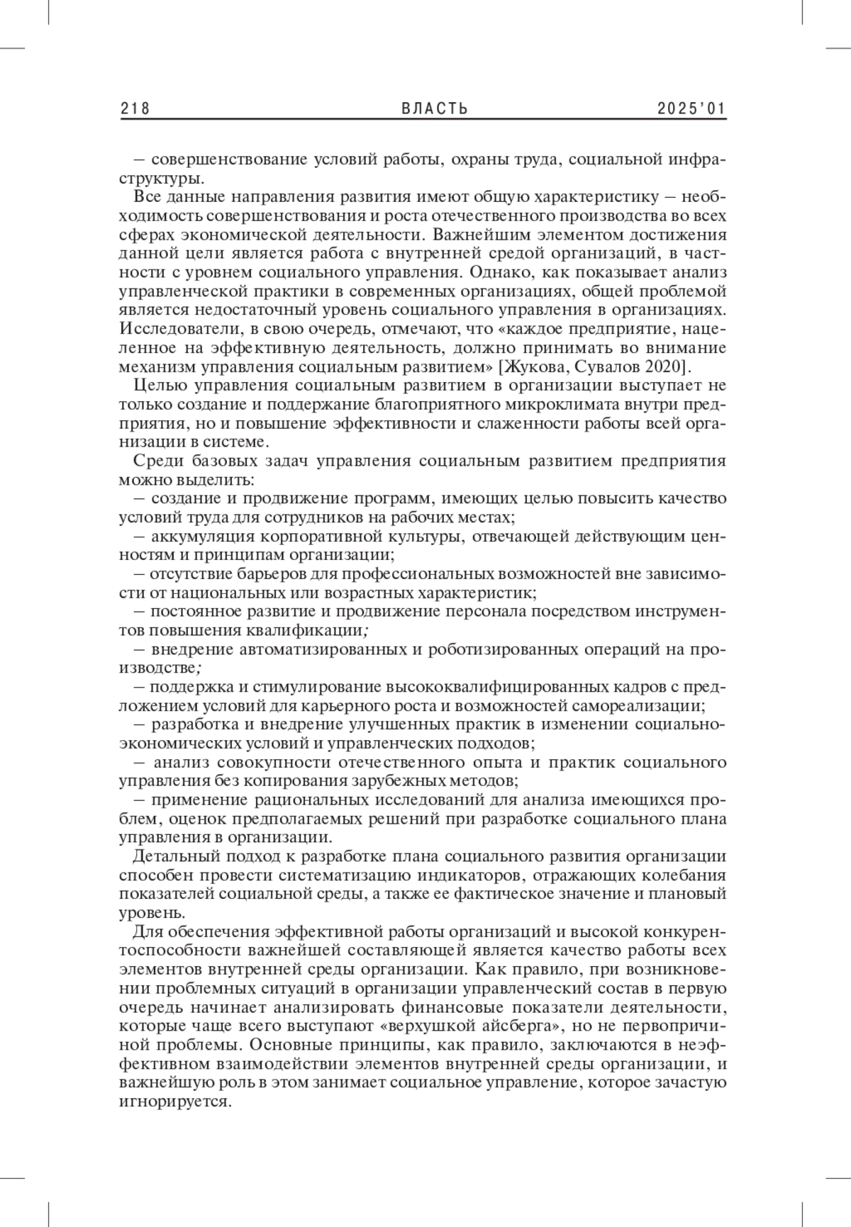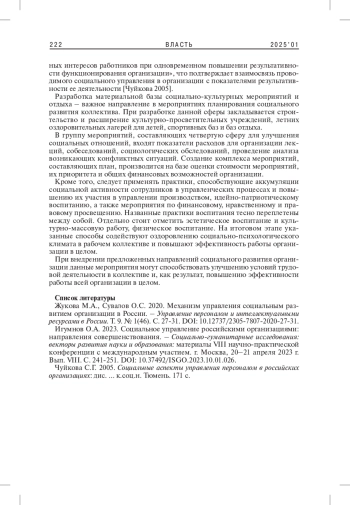 1. Жукова М.А., Сувалов О.С. 2020. Механизм управления социальным развитием организации в России. - Управление персоналом и интеллектуальными ресурсами в России. Т. 9. № 1(46). С. 27-31. DOI: 10.12737/2305-7807-2020-27-31 EDN: DTJJIP
