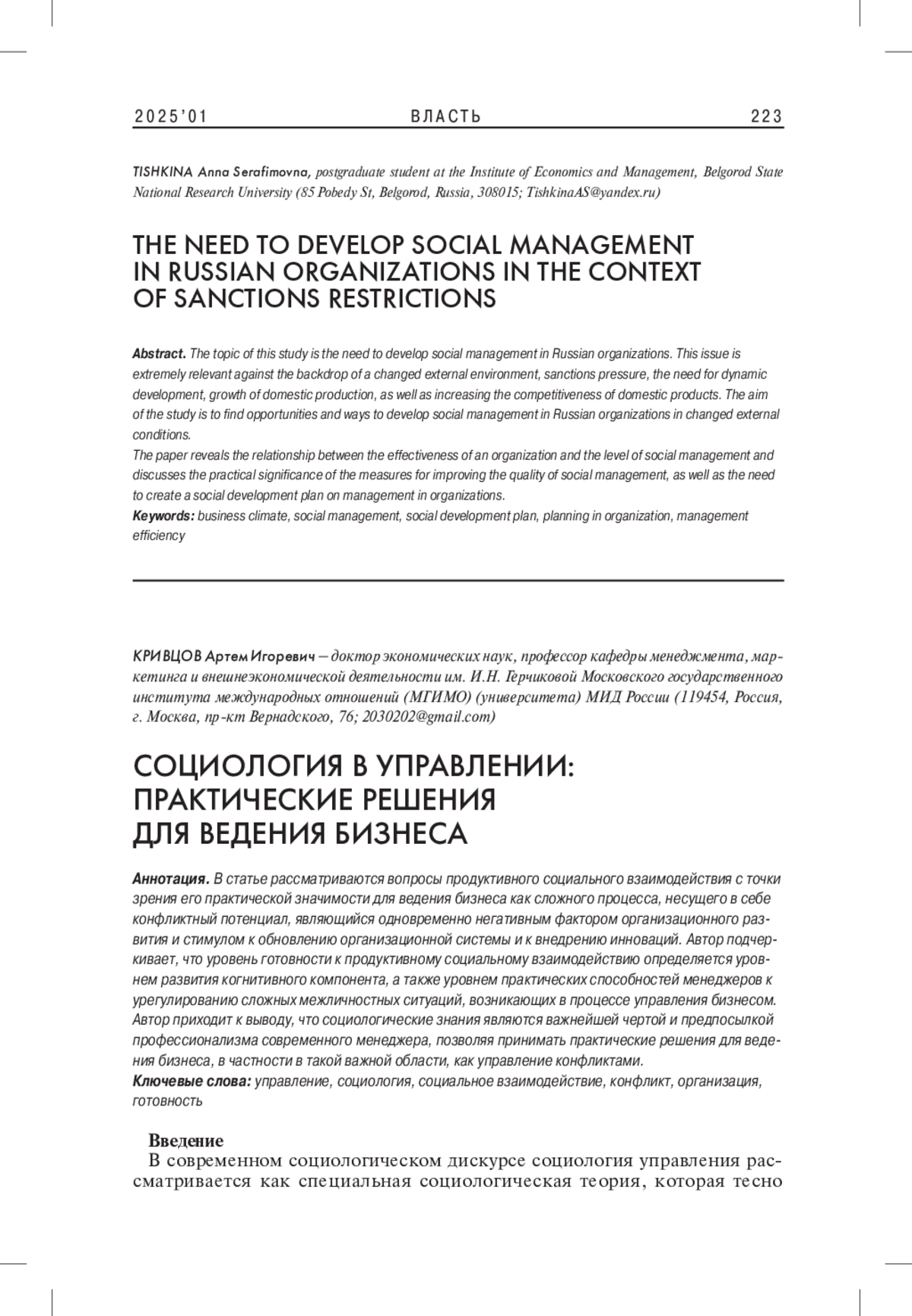 2. Игумнов О.А. 2023. Социальное управление российскими организациями: направления совершенствования. - Социально-гуманитарные исследования: векторы развития науки и образования: материалы VIII научно-практической конференции с международным участием. г. Москва, 20-21 апреля 2023 г. Вып. VIII. С. 241-251. DOI: 10.37492/ISGO.2023.10.01.026 EDN: TVIELE