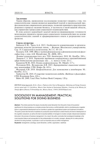 В статье рассматриваются вопросы продуктивного социального взаимодействия с точки зрения его практической значимости для ведения бизнеса как сложного процесса, несущего в себе конфликтный потенциал, являющийся одновременно негативным фактором организационного развития и стимулом к обновлению организационной системы и к внедрению инноваций. Автор подчеркивает, что уровень готовности к продуктивному социальному взаимодействию определяется уровнем развития когнитивного компонента, а также уровнем практических способностей менеджеров к урегулированию сложных межличностных ситуаций, возникающих в процессе управления бизнесом. Автор приходит к выводу, что социологические знания являются важнейшей чертой и предпосылкой профессионализма современного менеджера, позволяя принимать практические решения для ведения бизнеса, в частности в такой важной области, как управление конфликтами.