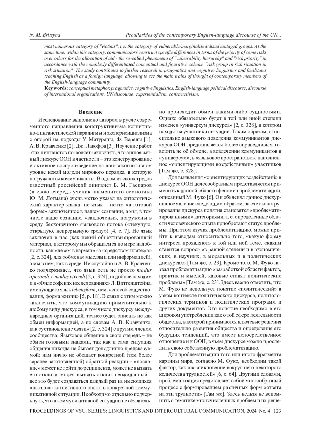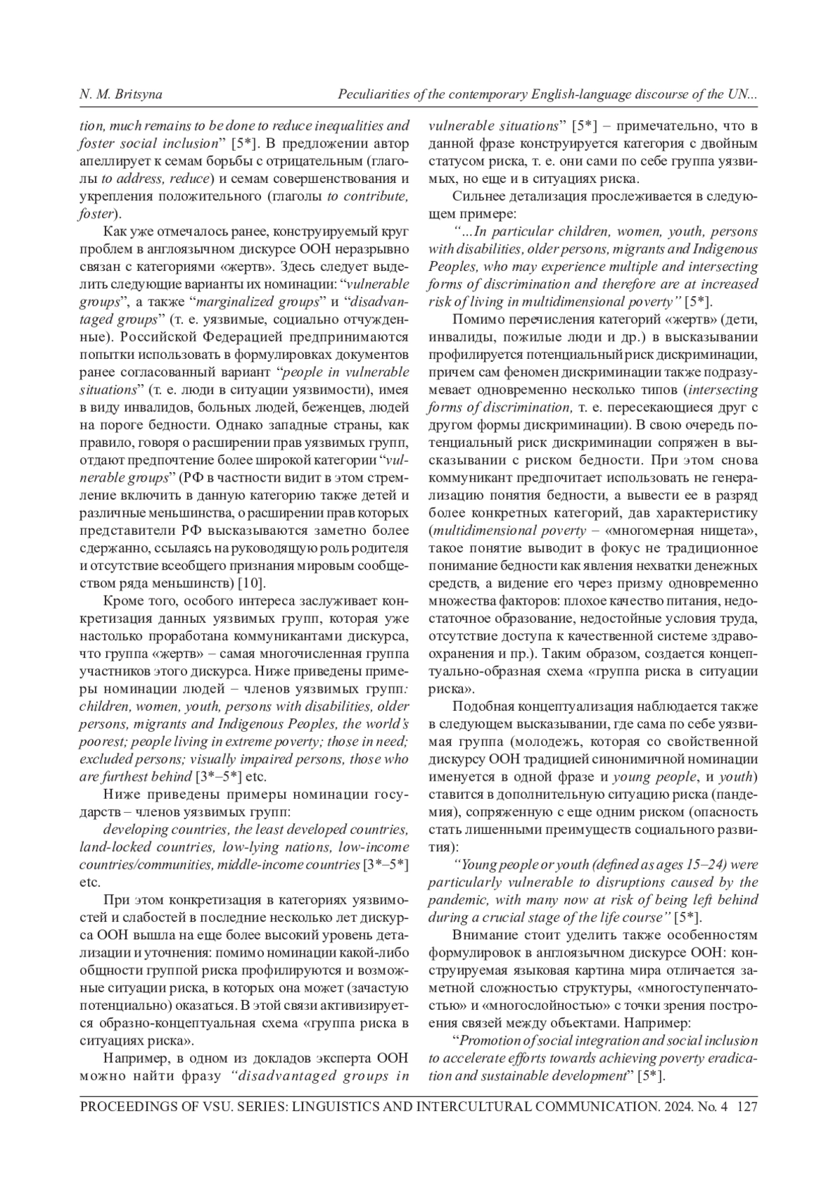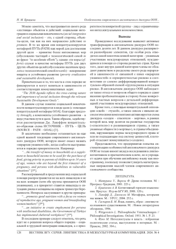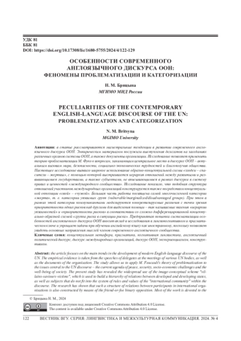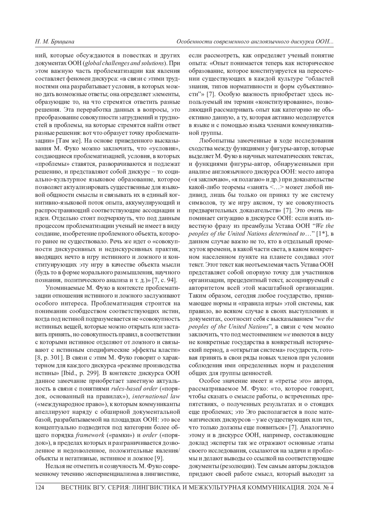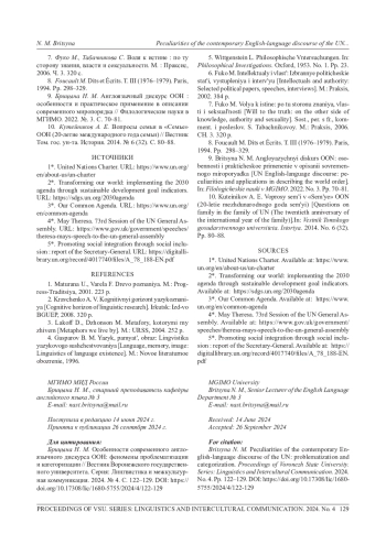 9. 	Брицына Н М. Англоязычный дискурс ООН: особенности и практическое применение в описании современного миропорядка // Филологические науки в МГИМО. 2022. №. 3. С. 70-81. EDN: RLAKAM