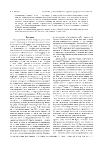 В статье рассматриваются магистральные тенденции в развитии современного англоязычного дискурса ООН. Эмпирическим материалом послужили выступления делегатов на заседаниях различных органов системы ООН, а также документы организации. Исследование позволяет применить теорию проблематизации М. Фуко к вопросам, занимающим центральное место в дискурсе ООН- актуальным вызовам мира, безопасности, социально-экономических трудностей и благополучия общества. Настоящее исследование выявило широкое использование образно-концептуальной схемы «злодеи - спасители - жертвы», с помощью которой выстраивается иерархия отношений между развитыми и развивающимися государствами, а также субъектами, не вписывающимися в рамках дискурса в систему правил и ценностей «международного сообщества». Исследование показало, что подобная структура отношений участников международных организаций конструируется также посредством концептуальной оппозиции «свой» - «чужой». Большая часть работы посвящена самой многочисленной категории «жертв», т. е. категории уязвимых групп (vulnerable/marginalized/disadvantaged groups). При этом в рамках этой категории коммуникантами моделируются конкретизируемые различия с точки зрения приоритетности одних рисков над другими для выделения помощи - так называемые явления «иерархии уязвимостей» и «приоритетности рисков» в соответствии со сложно дифференцированной концептуально-образной схемой «группа риска в ситуации риска». Предпринятая попытка систематизации особенностей англоязычного дискурса ООН вносит вклад в исследования в лингвокогнитивном и прагматическом ключе и упрощает задачи при обучении английскому языку как иностранному, поскольку позволяет увидеть основные направления мыслей членов современного англоязычного сообщества.