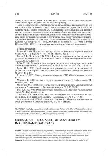 Статья посвящена исследованию суверенитета в социальном учении католицизма, неотъемлемой частью которого выступают эволюция и модернизация представлений церкви о государстве и праве. Анализируются источники, содержащие католическое социальное учение, понятие и сущность суверенитета, которые касаются политического общества и государства, представленные главным идеологом католического модернизма Ж. Маритеном. Автор делает вывод, что независимость и власть государства являются относительными, т. к. оно получает их как следствие передачи политическому обществу в силу конституции.