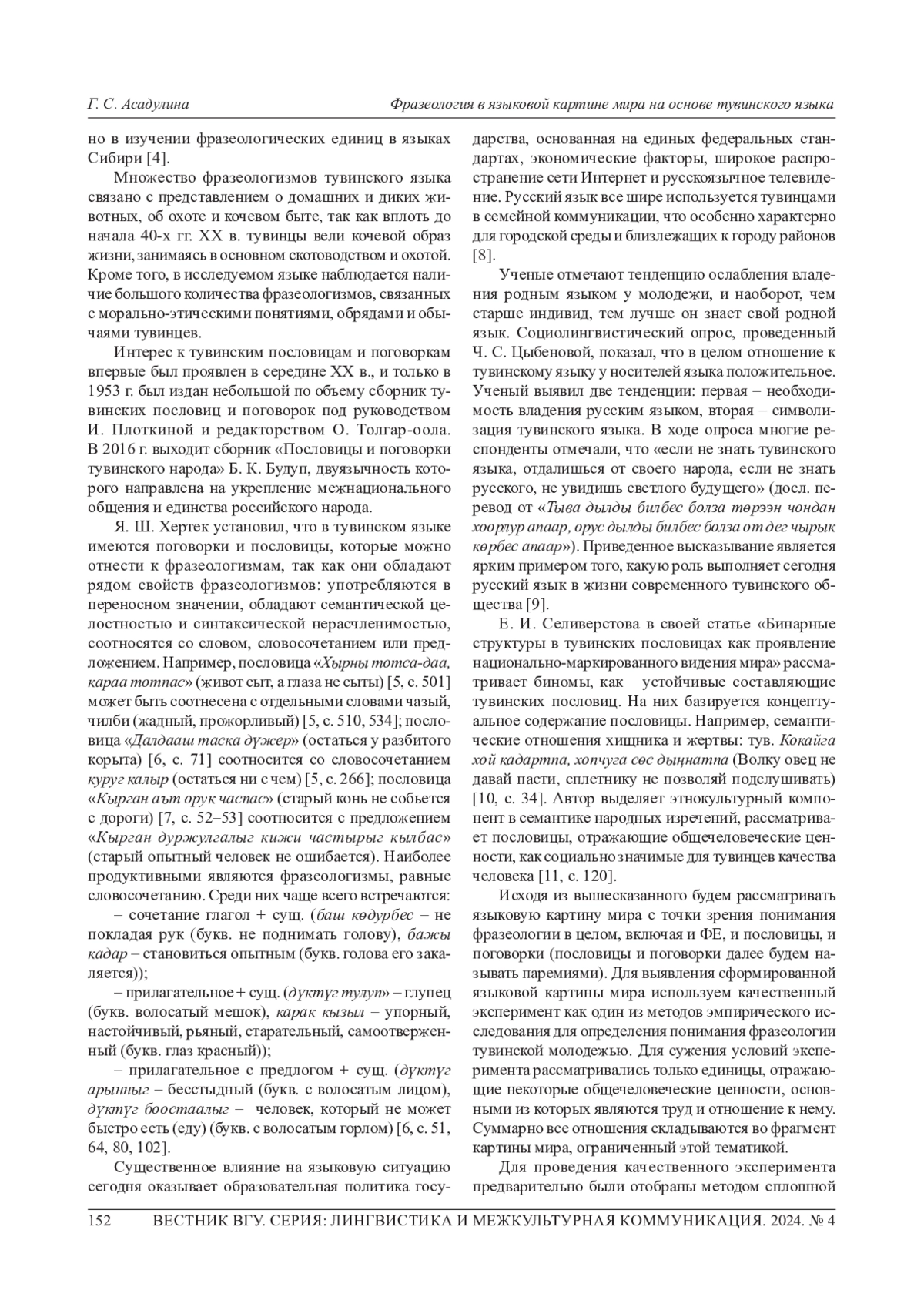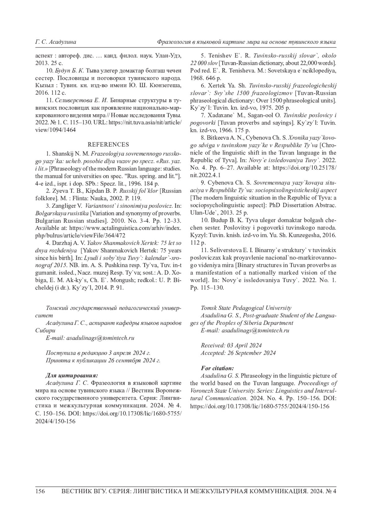 11. 	Селиверстова Е. И. Бинарные структуры в тувинских пословицах как проявление национально-маркированного видения мира//Новые исследования Тувы. 2022. № 1. С. 115-130. URL: https://nit.tuva.asia/nit/article/view/1094/1464. EDN: WNWGKA