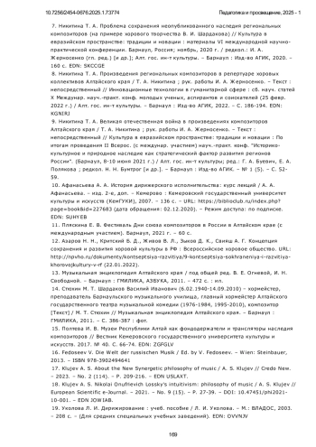 8. 	Никитина Т. А. Произведения региональных композиторов в репертуаре хоровых коллективов Алтайского края / Т. А. Никитина; рук. работы И. А. Жерносенко. - Текст: непосредственный // Инновационные технологии в гуманитарной сфере: сб. науч. статей X Междунар. науч.-практ. конф. молодых ученых, аспирантов и соискателей (25 февр. 2022 г.) / Алт. гос. ин-т культуры. - Барнаул: Изд-во АГИК, 2022. - С. 186-194. EDN: KGNIRJ