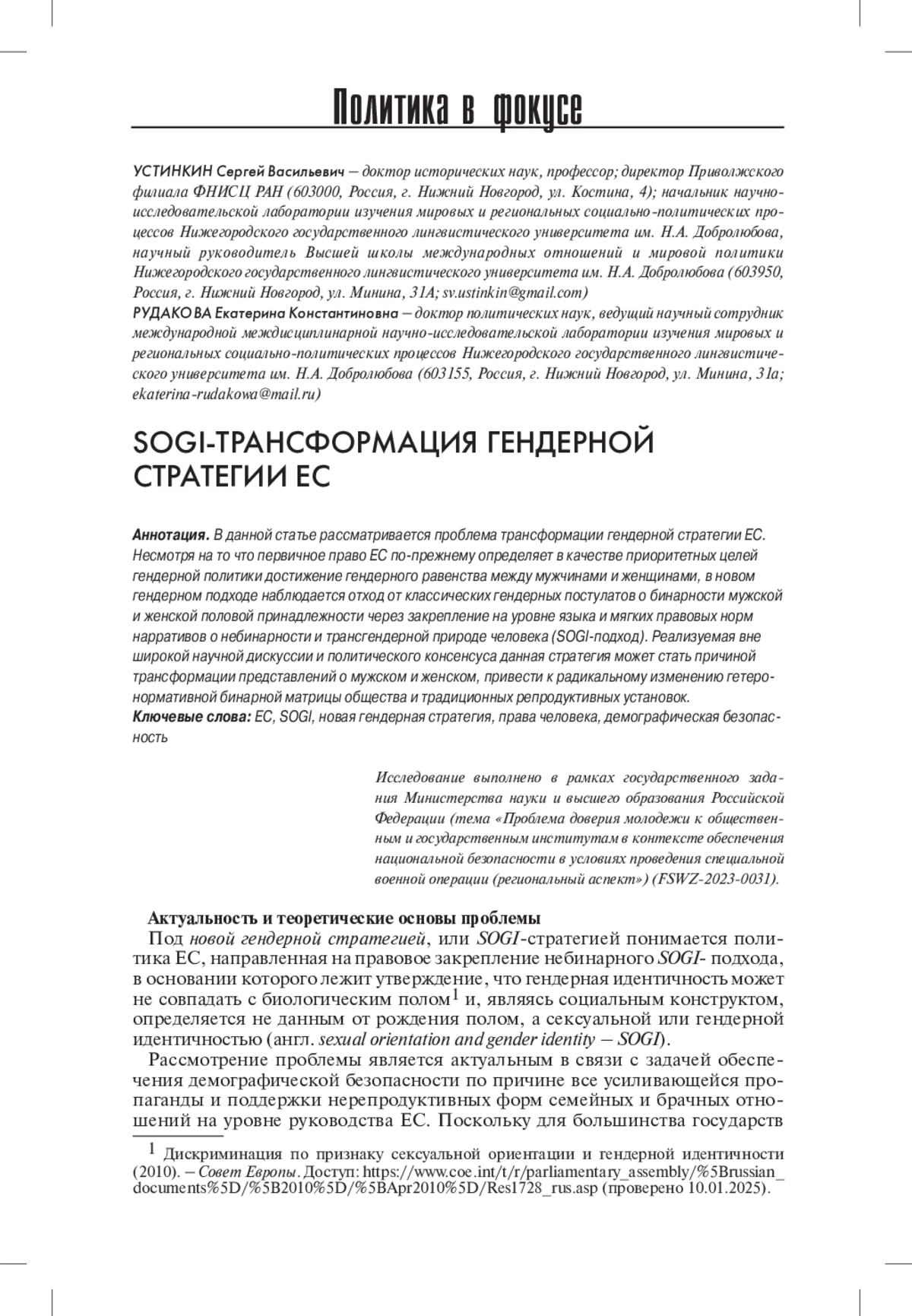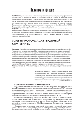 В данной статье рассматривается проблема трансформации гендерной стратегии ЕС. Несмотря на то что первичное право ЕС по-прежнему определяет в качестве приоритетных целей гендерной политики достижение гендерного равенства между мужчинами и женщинами, в новом гендерном подходе наблюдается отход от классических гендерных постулатов о бинарности мужской и женской половой принадлежности через закрепление на уровне языка и мягких правовых норм нарративов о небинарности и трансгендерной природе человека (SOGI-подход). Реализуемая вне широкой научной дискуссии и политического консенсуса данная стратегия может стать причиной трансформации представлений о мужском и женском, привести к радикальному изменению гетеронормативной бинарной матрицы общества и традиционных репродуктивных установок.