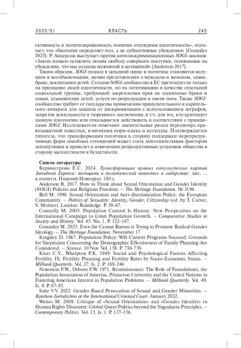 1. Бурмистрова Е.С. 2024. Трансформация правых популистских партий Западной Европы: женщины в политической повестке и лидерстве: дис. … к.полит.н. Нижний Новгород. 180 с. EDN: WIBBTU