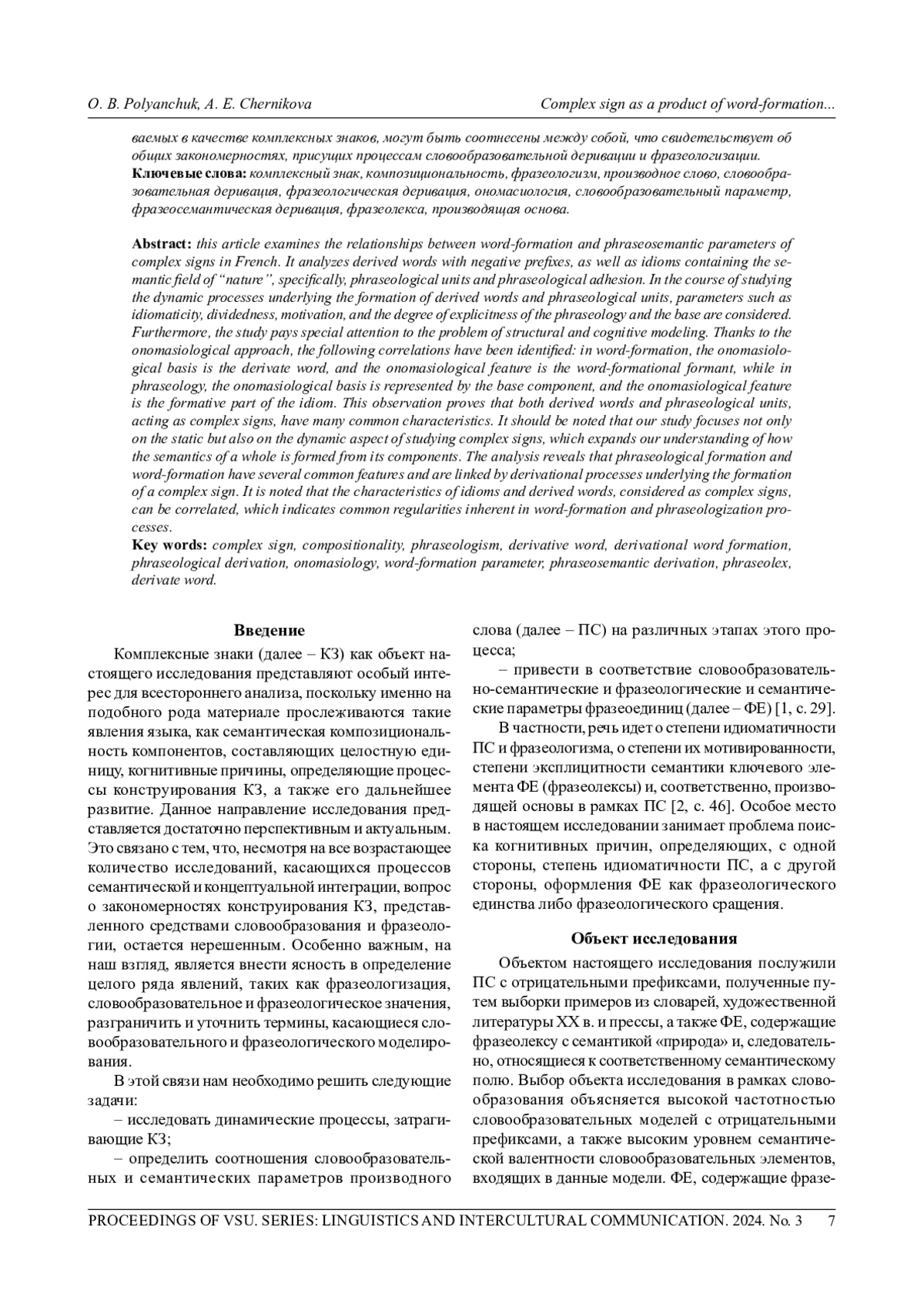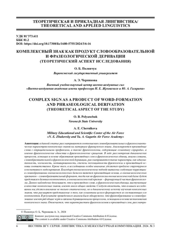 В данной статье рассматриваются соотношения словообразовательных и фразеосемантических параметров комплексных знаков на материале французского языка. Анализируются производные слова с отрицательными префиксами, а также фразеологизмы, содержащие семантику «природа», а именно фразеологические единства и фразеологические сращения. В ходе рассмотрения динамических процессов, лежащих в основе образования производных слов и фразеологических единиц, иными словами, словообразовательной и фразеологической деривации, рассматриваются такие параметры, как идиоматичность, членимость, мотивированность, степень эксплицитности фразеолексы и производящей основы соответственно. Кроме того, в исследовании особое внимание уделяется проблеме структурного и когнитивного моделирования. Благодаря ономасиологическому подходу выявлены следующие корреляции: в словообразовании ономасиологическим базисом является производящая основа, а ономасиологическим признаком - словообразовательный формант, тогда как во фразеологии ономасиологический базис будет представлен базовым компонентом, а ономасиологический признак - формирующей частью фразеологизма. Данное наблюдение доказывает, что и производное слово, и фразеологическая единица, выступающие в качестве комплексных знаков, имеют много общих свойств. Следует отметить, что в нашем исследовании мы уделяем внимание не только статическому, но и динамическому аспекту изучения комплексных знаков, что расширяет представление о том, как семантика целого формируется из составляющих его компонентов. В результате проведенного анализа было обнаружено, что фразообразование и словообразование имеют ряд общих черт и связаны деривационными процессами, лежащими в основе возникновения комплексного знака. Отмечается, что характеристики фразеологизмов и производных слов, рассматри ваемых в качестве комплексных знаков, могут быть соотнесены между собой, что свидетельствует об общих закономерностях, присущих процессам словообразовательной деривации и фразеологизации.