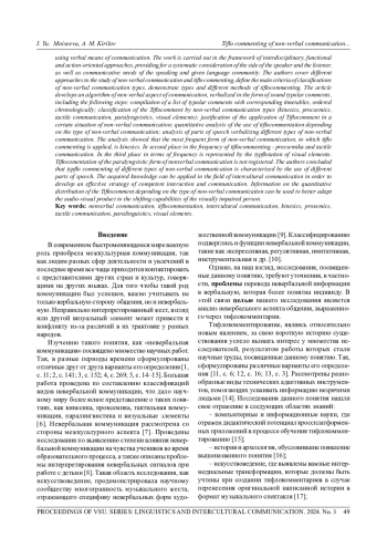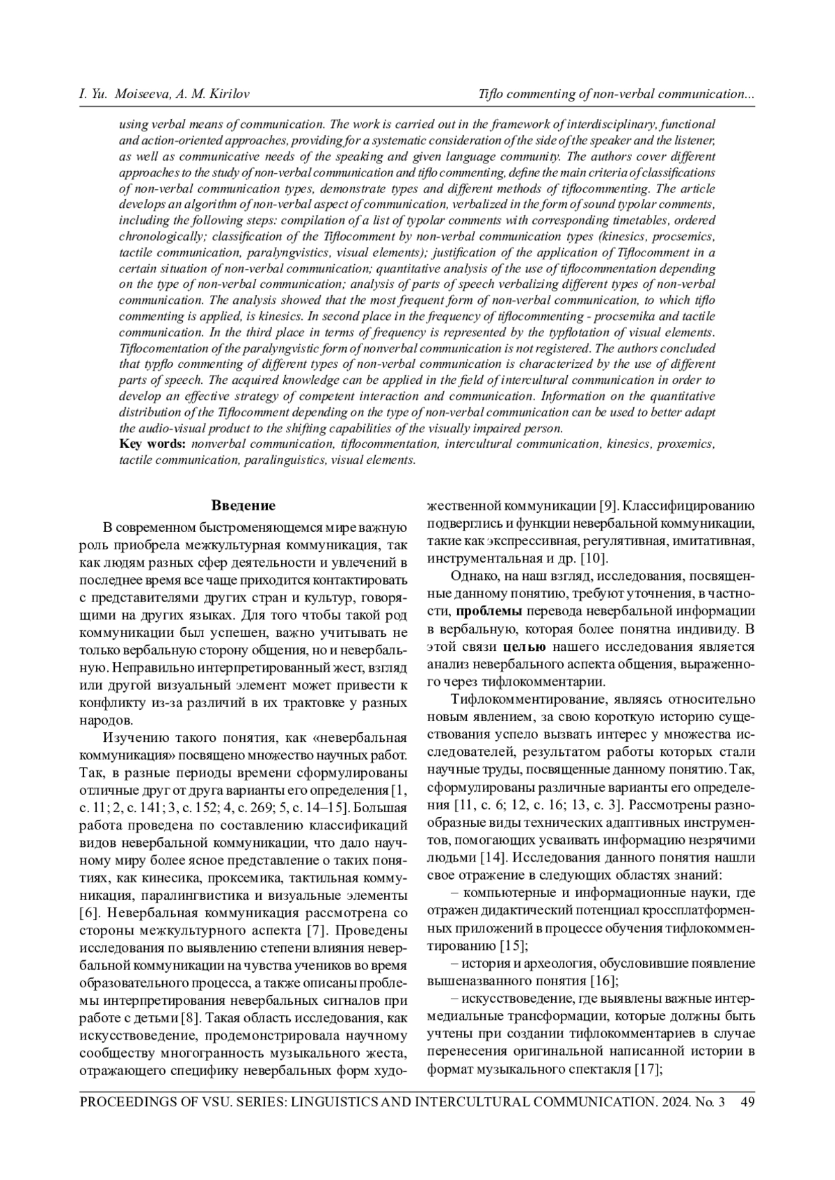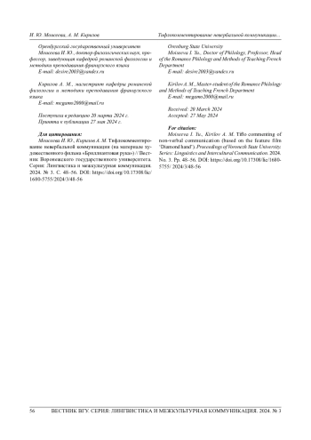 Исследование посвящено анализу невербального аспекта общения, вербализованного в виде звуковых тифлокомментариев. Материалом исследования послужил художественный фильм режиссера Леонида Гайдая «Бриллиантовая рука» с тифлокомментированием. Выбрано 85 фрагментов, в которых при помощи вербальных средств передачи информации описаны невербальные аспекты коммуникации. Работа выдержана в русле междисциплинарного, функционального и деятельностного подходов, предусматривающих системный учет стороны говорящего и слушающего, а также коммуникативные потребности говорящего и данного языкового сообщества. Авторы освещают различные подходы к изучению вопросов невербальной коммуникации и тифлокомментирования, определяют основные критерии классификаций видов невербальной коммуникации, демонстрируют виды и различные методы тифлокомментирования. В статье разработан алгоритм исследования невербального аспекта общения, вербализованного в виде звуковых тифлокомментариев, включающий следующие этапы: составление списка тифлокомментариев с соответствующими им таймкодами, упорядоченный хронологически; классификация тифлокомментариев по видам невербальной коммуникации (кинесика, проксемика, тактильная коммуникация, паралингвистика, визуальные элементы); обоснование применения тифлокомментариев в определенной ситуации невербального общения; количественный анализ использования тифлокомментирования в зависимости от вида невербальной коммуникации; анализ частей речи, вербализующих различные виды невербальной коммуникации. Анализ показал, что наиболее частотным видом невербального общения, к которому применено тифлокомментирование, является кинесика. На втором месте по частотности тифлокомментирования - проксемика и тактильная коммуникация. На третьем месте по частотности представлено тифлокомментирование визуальных элементов. Тифлокоментирование паралингвистического вида невербальной коммуникации не зарегистрировано. Авторы пришли к выводу о том, что тифлокомментирование различных видов невербальной коммуникации характеризуется использованием различных частей речи. Полученные знания могут быть применены в области межкультурной коммуникации с целью разработки эффективной стратегии грамотного взаимодействия и общения. Сведения о количественном распределении тифлокомментариев в зависимости от вида невербальной коммуникации могут использоваться для лучшей адаптации аудиовизуального произведения к перцептивным возможностям человека с нарушенным зрением.