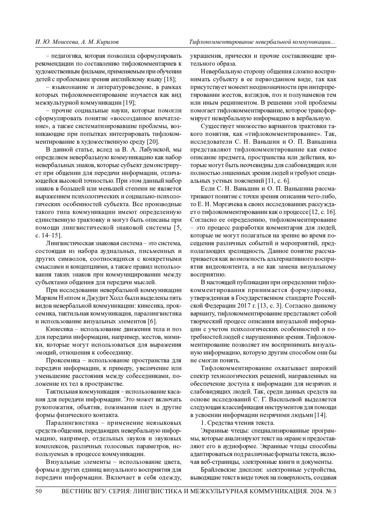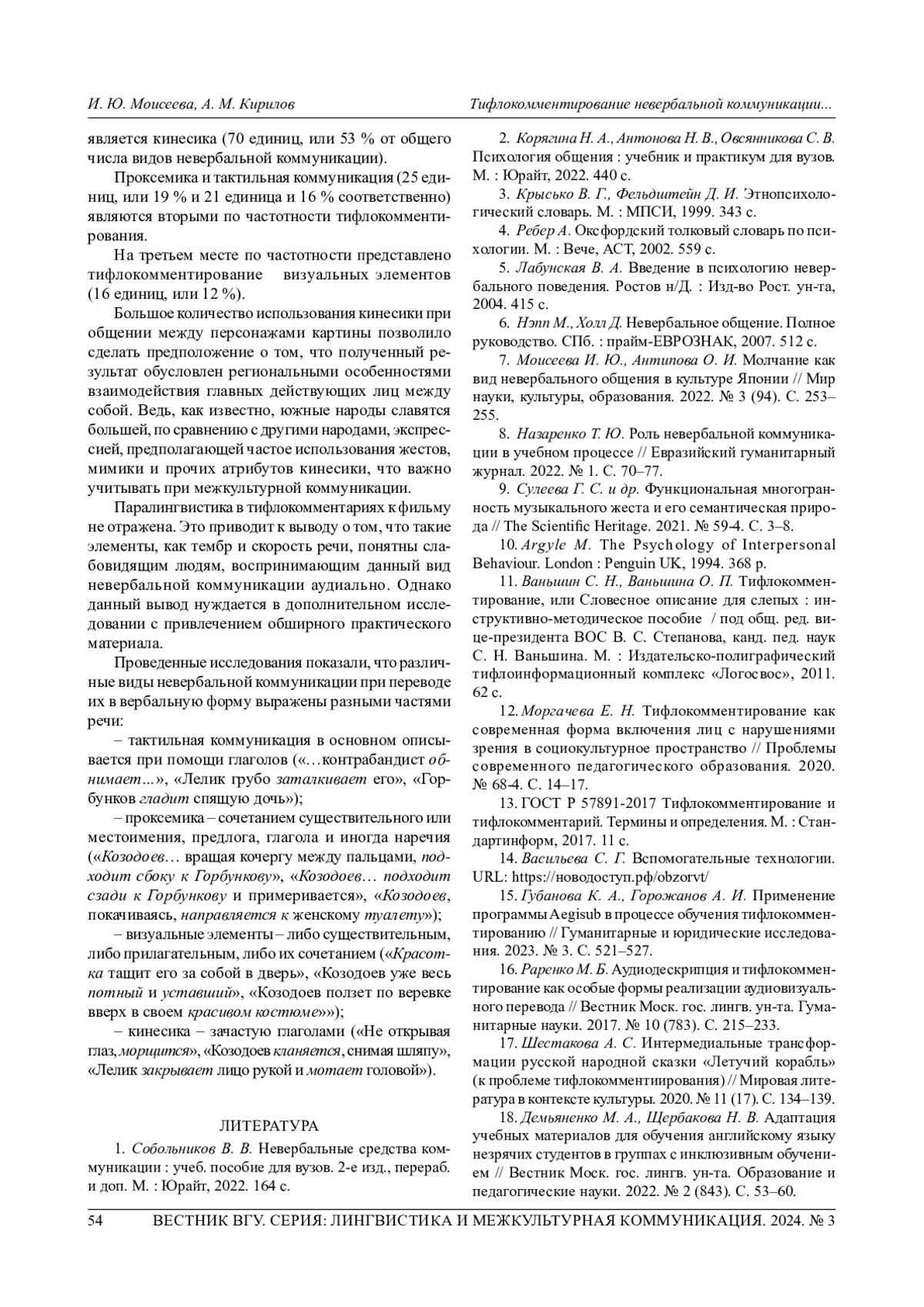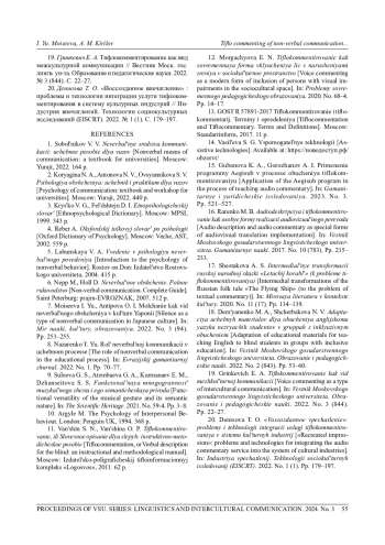 19. 	Гринкевич Е. А. Тифлокомментирование как вид межкультурной коммуникации // Вестник Моск. гос. лингв. ун-та. Образование и педагогические науки. 2022. № 3 (844). С. 22-27. EDN: NSDGST