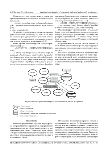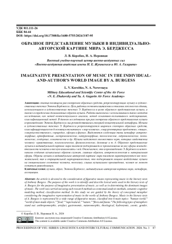 Статья посвящена рассмотрению образных средств, репрезентирующих музыку в художественных текстах Энтони Берджесса. Цель работы состоит в выявлении и описании лексических единиц, использующихся в художественных текстах Э. Берджесса в целях образного представления музыки, а также в определении доминантных образов музыки. Работа выполнена с использованием таких методов исследования, как метод контекстуального анализа, метод семантико-когнитивного моделирования, классификационный метод. В данном исследовании при рассмотрении образного представления музыки в произведениях Энтони Берджесса мы руководствовались теорией концептуальной метафоры. Музыка в художественных текстах Э. Берджесса репрезентируется широким спектром образных средств, классифицирующихся по 6 основным тематикам: «мир человека», «миррукотворных предметов», «пища», «сверхъестественное», «природа», «флора и фауна». Выделяются следующие типы метафор: антропоморфные, артефактные, гастрономические, натуроморфные, теологические, гидронимические, зоонимические, гендерные, соматические и др. Музыка наделяется множеством черт, которые свойственны человеку: нравственные, психологические, физиологические, духовные и т. д. Образное представление музыки в индивидуальной картине мира писателя подчеркивает ее проникновение во все сферы жизнедеятельности человека и тесную взаимосвязь с ней. Отмечается, что в произведениях Э. Берджесса источниками создания музыкальных образов служат, главным образом, антропологическая и материальная сферы. Образы музыки в индивидуально-авторской картине мира писателя характеризуются как положительной, так и отрицательной маркированностью, что подчеркивает мощное воздействие музыки на эмоциональное состояние человека, поскольку, слыша музыкальное произведение, человек не может остаться равнодушным.