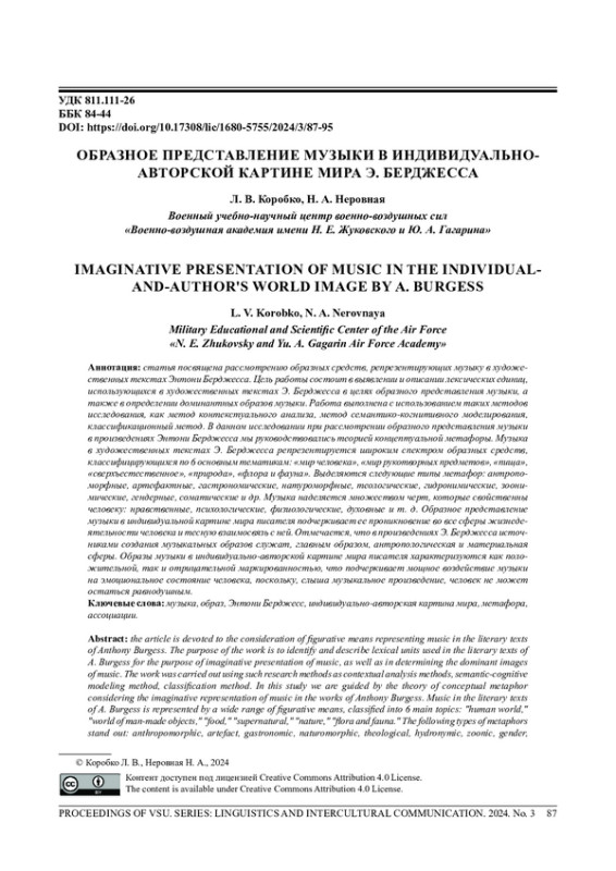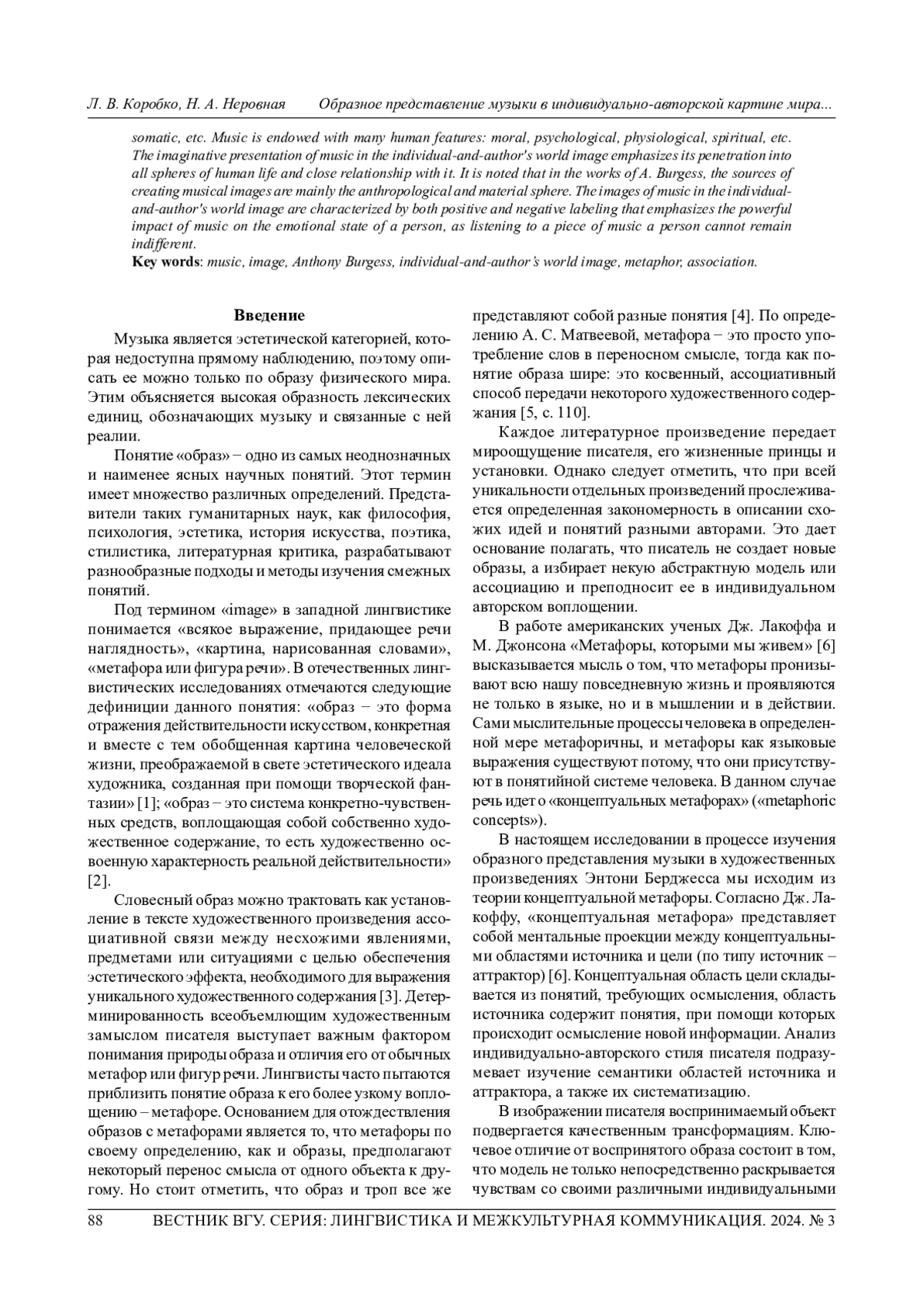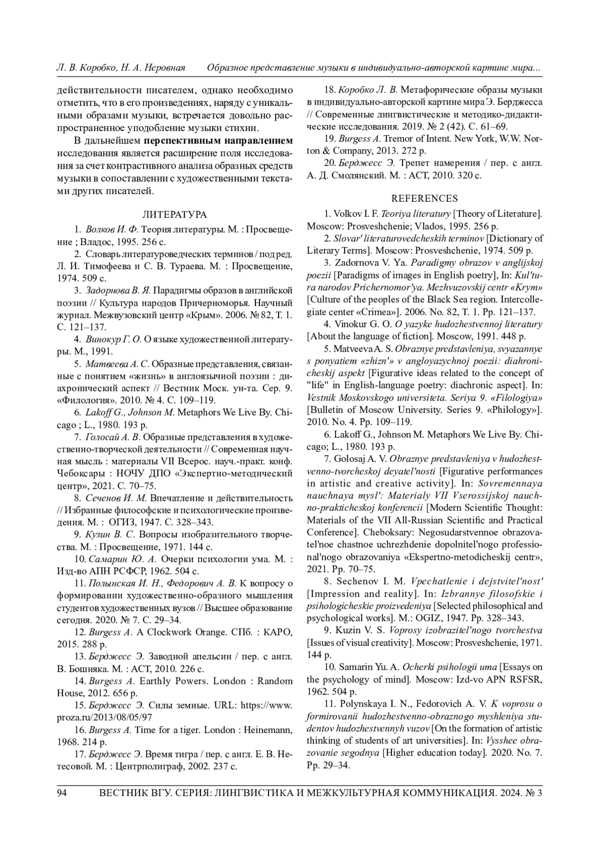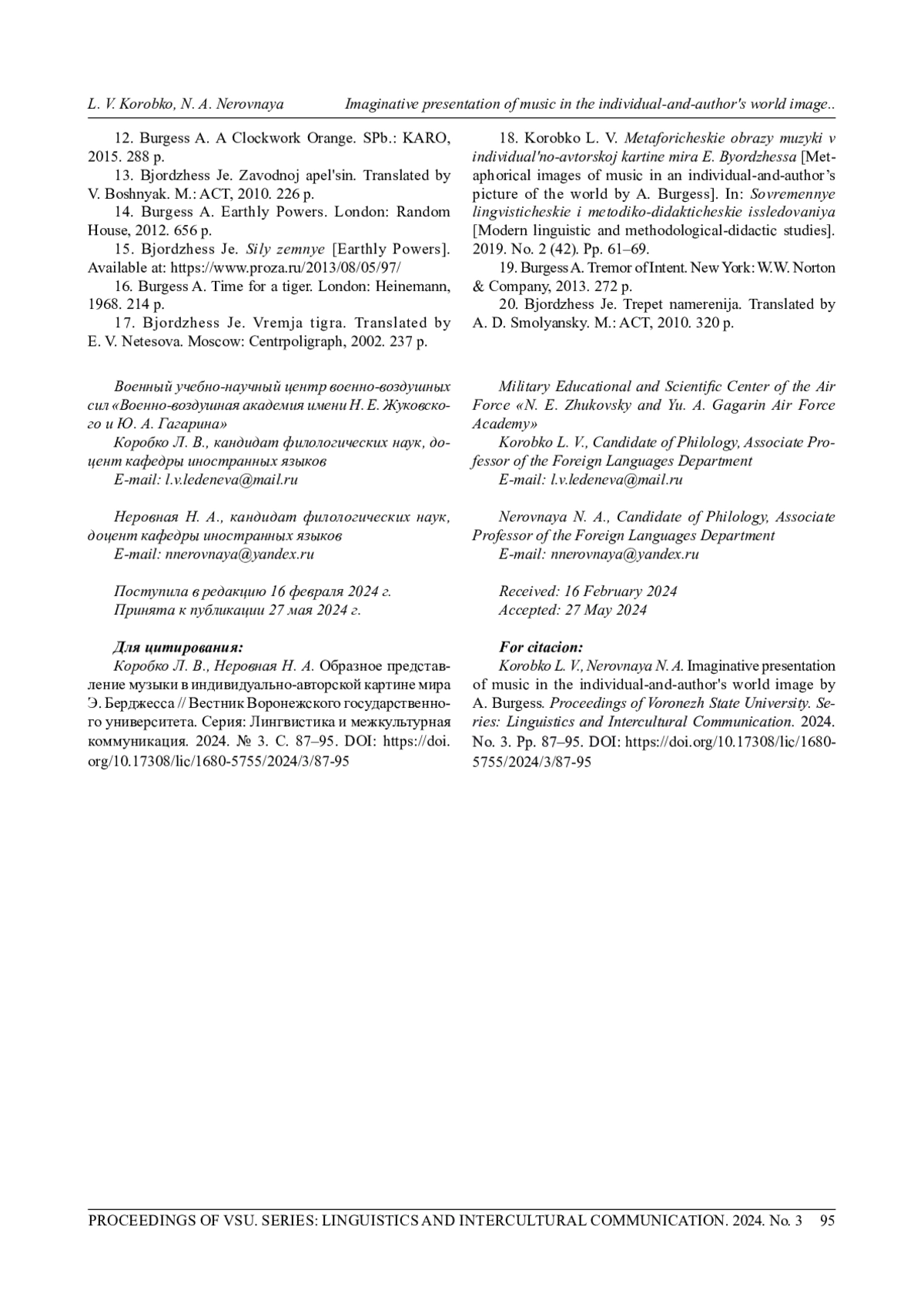 18. 	Коробко Л. В. Метафорические образы музыки в индивидуально-авторской картине мира Э. Берджесса // Современные лингвистические и методико-дидактические исследования. 2019. № 2 (42). С. 61-69.