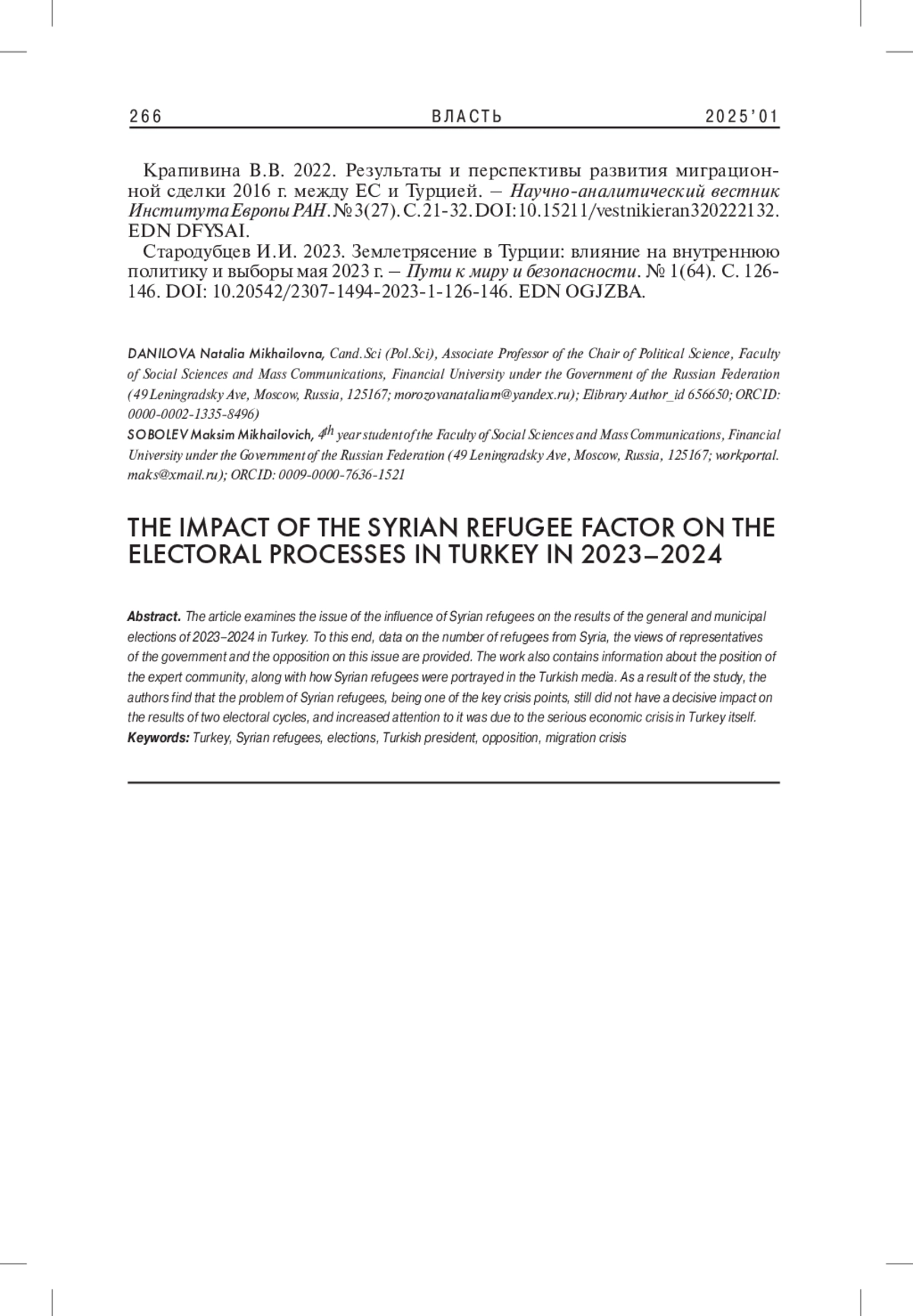 5. 	Стародубцев И.И. 2023. Землетрясение в Турции: влияние на внутреннюю политику и выборы мая 2023 г. - Пути к миру и безопасности. № 1(64). С. 126-146. DOI: 10.20542/2307-1494-2023-1-126-146 EDN: OGJZBA