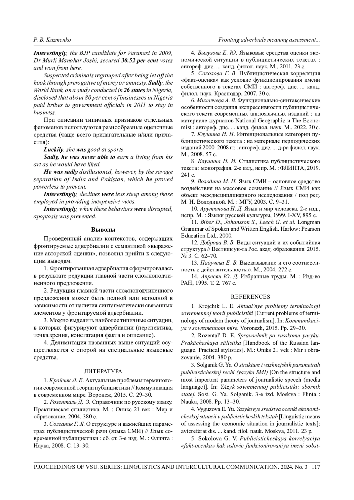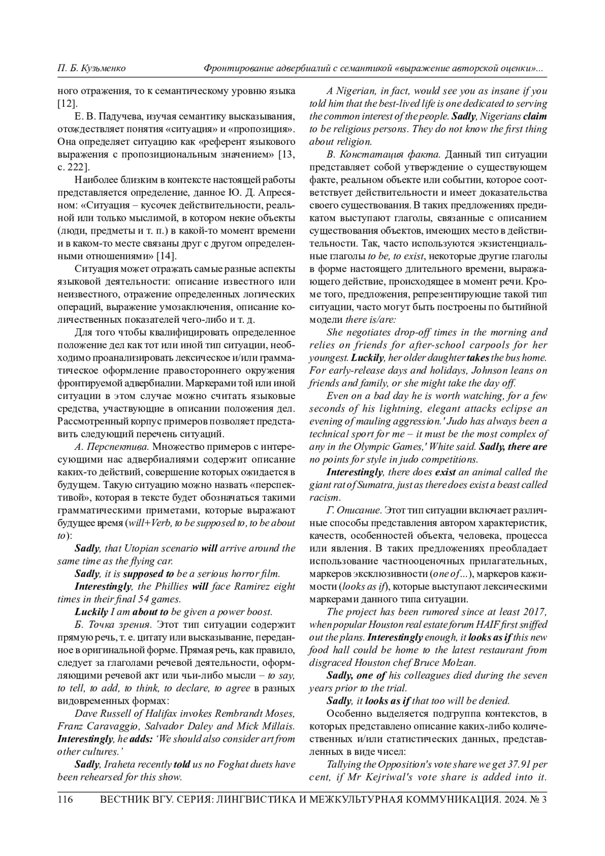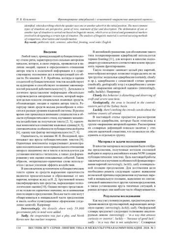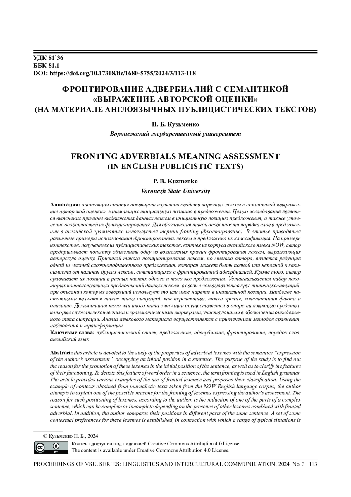 Настоящая статья посвящена изучению свойств наречных лексем с семантикой «выражение авторской оценки», занимающих инициальную позицию в предложении. Целью исследования является выяснение причины выдвижения данных лексем в инициальную позицию предложения, а также уточнение особенностей их функционирования. Для обозначения такой особенности порядка слов в предложении в английской грамматике используется термин fronting (фронтирование). В статье приводятся различные примеры использования фронтированных лексем и предложена их классификация. На примере контекстов, полученных из публицистических текстов, взятых из корпуса английского языка NOW, автор предпринимает попытку объяснить одну из возможных причин фронтирования лексем, выражающих авторскую оценку. Причиной такого позиционирования лексем, по мнению автора, является редукция одной из частей сложноподчиненного предложения, которая может быть полной или неполной в зависимости от наличия других лексем, сочетающихся с фронтированной адвербиалией. Кроме того, автор сравнивает их позиции в разных частях одного и того же предложения. Устанавливается набор некоторых контекстуальных предпочтений данных лексем, в связи с чем выявляется круг типичных ситуаций, при описании которых говорящий использует то или иное наречие в инициальной позиции. Наиболее частотными являются такие типы ситуаций, как перспектива, точка зрения, констатация факта и описание. Делимитация того или иного типа ситуации осуществляется в опоре на языковые средства, которые служат лексическими и грамматическими маркерами, участвующими в обозначении определенного типа ситуации. Анализ языкового материала осуществляется с привлечением методов сравнения, наблюдения и трансформации.