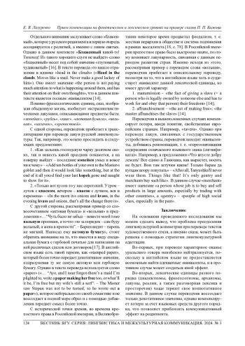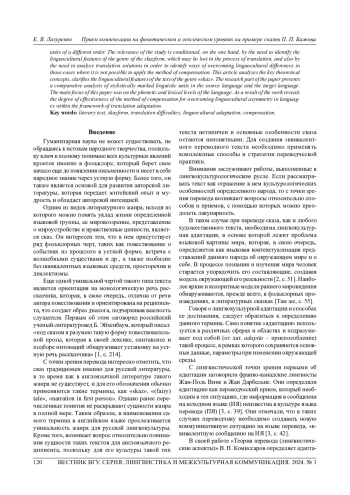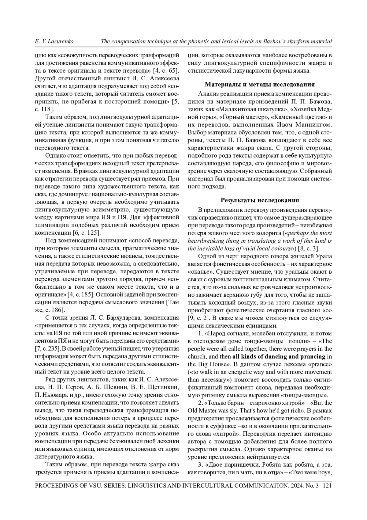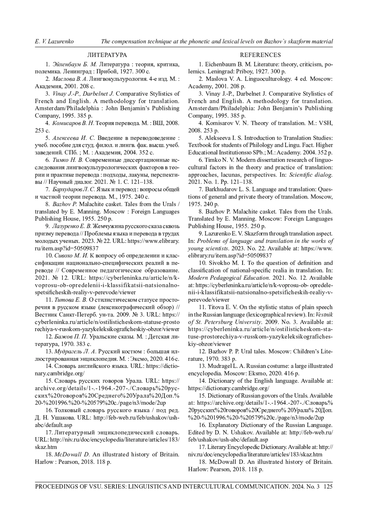 9. 	Лазуренко Е. В. Жемчужина русского сказа сквозь призму перевода // Проблемы языка и перевода в трудах молодых ученых. 2023. № 22. URL: item.asp?id=50509837. EDN: KBIDFL