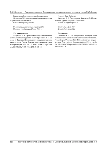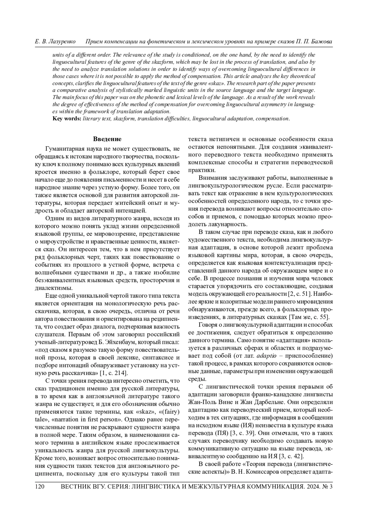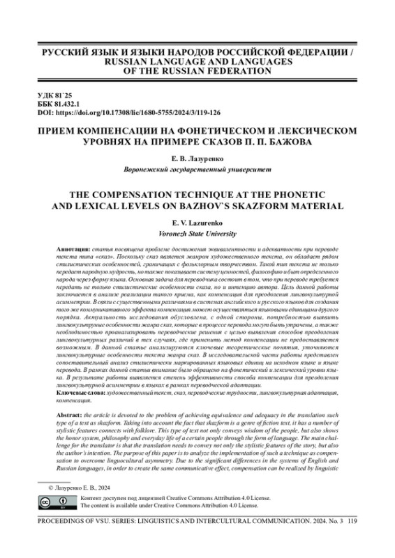 Статья посвящена проблеме достижения эквивалентности и адекватности при переводе текста типа «сказ». Поскольку сказ является жанром художественного текста, он обладает рядом стилистических особенностей, граничащих с фольклорным творчеством. Такой тип текста не только передает народную мудрость, но также показывает систему ценностей, философию и быт определенного народа через форму языка. Основная задача для переводчика состоит в том, что при переводе требуется передать не только стилистические особенности сказа, но и интенцию автора. Цель данной работы заключается в анализе реализации такого приема, как компенсация для преодоления лингвокультурной асимметрии. В связи с существенными различиями в системах английского и русского языков для создания того же коммуникативного эффекта компенсация может осуществляться языковыми единицами другого порядка. Актуальность исследования обусловлена, с одной стороны, потребностью выявить лингвокультруные особенности жанра сказ, которые в процессе перевода могут быть утрачены, а также необходимостью проанализировать переводческие решения с целью выявления способов преодоления лингвокультурных различий в тех случаях, где применить метод компенсации не предоставляется возможным. В данной статье анализируются ключевые теоретические понятия, уточняются лингвокультурные особенности текста жанра сказ. В исследовательской части работы представлен сопоставительный анализ стилистически маркированных языковых единиц на исходном языке и языке перевода. В рамках данной статьи внимание было обращено на фонетический и лексический уровни языка. В результате работы выявляется степень эффективности способа компенсации для преодоления лингвокультурной асимметрии в языках в рамках переводческой адаптации.