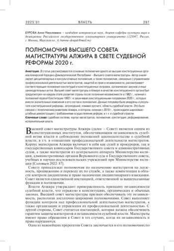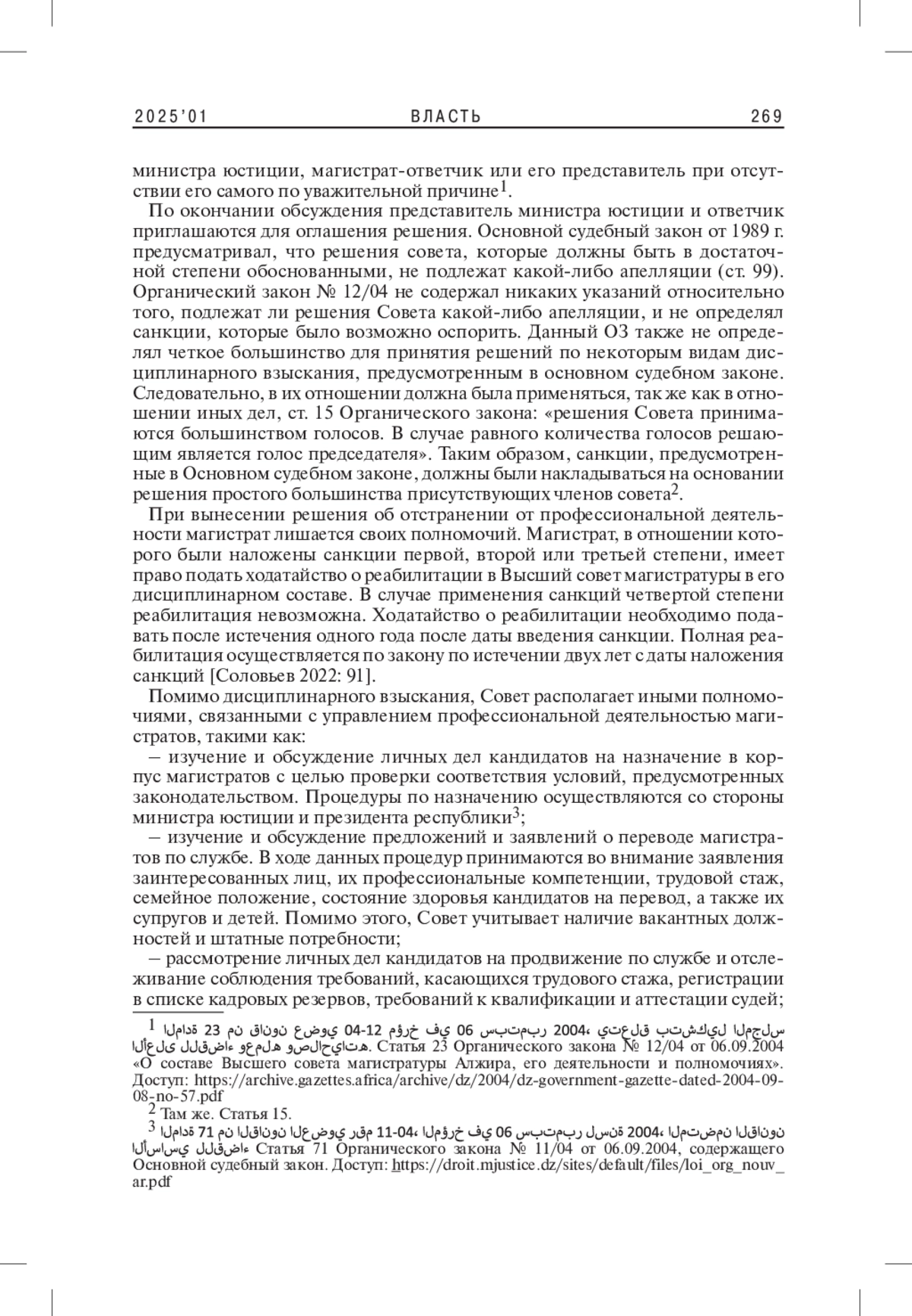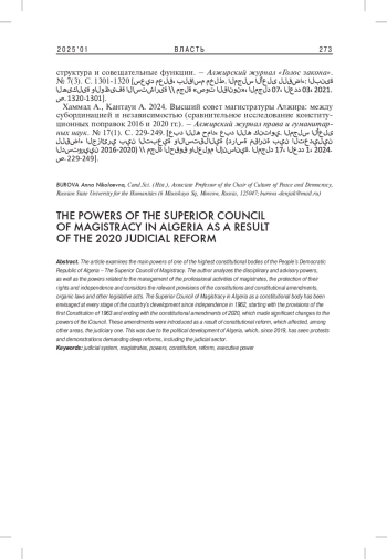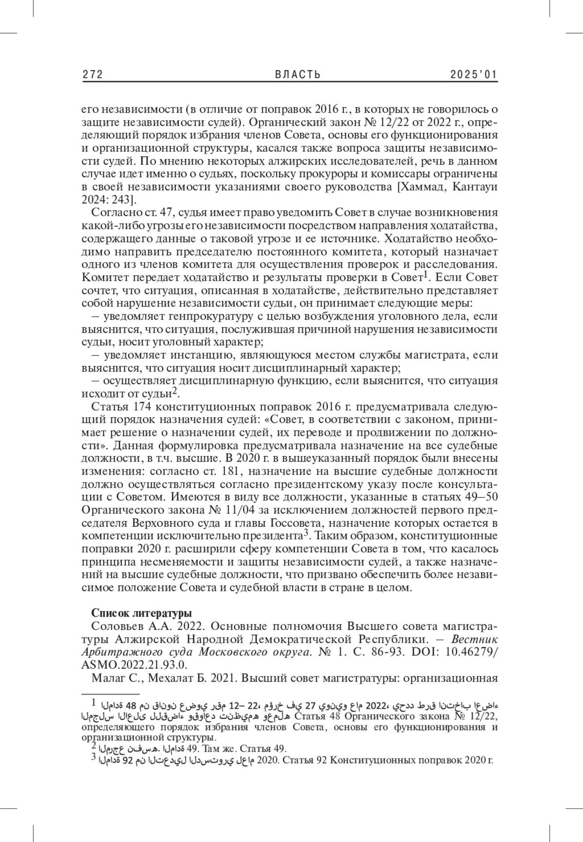 1. 	Соловьев А.А. 2022. Основные полномочия Высшего совета магистратуры Алжирской Народной Демократической Республики. - Вестник Арбитражного суда Московского округа. № 1. С. 86-93. DOI: 10.46279/ASMO.2022.21.93.0