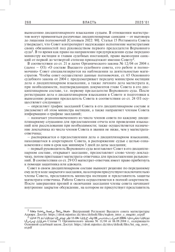 3. 	Хаммад А., Кантауи А. 2024. Высший совет магистратуры Алжира: между субординацией и независимостью (сравнительное исследование конституционных поправок 2016 и 2020 гг.). - Алжирский журнал права и гуманитарных наук. № 17(1). С. 229-249. [عبد الله حماد، عبد الله كنتاوي. المجلس الأعلى للقضاء الجزائري بين التبعية والاستقلالية (دراسة مقارنة بين التعديلين الدستوريين 2016-2020) // مجلة الحقوق والعلوم الإنسانية. المجلد 17، العدد 1، 2024. ص. 229-249.].
