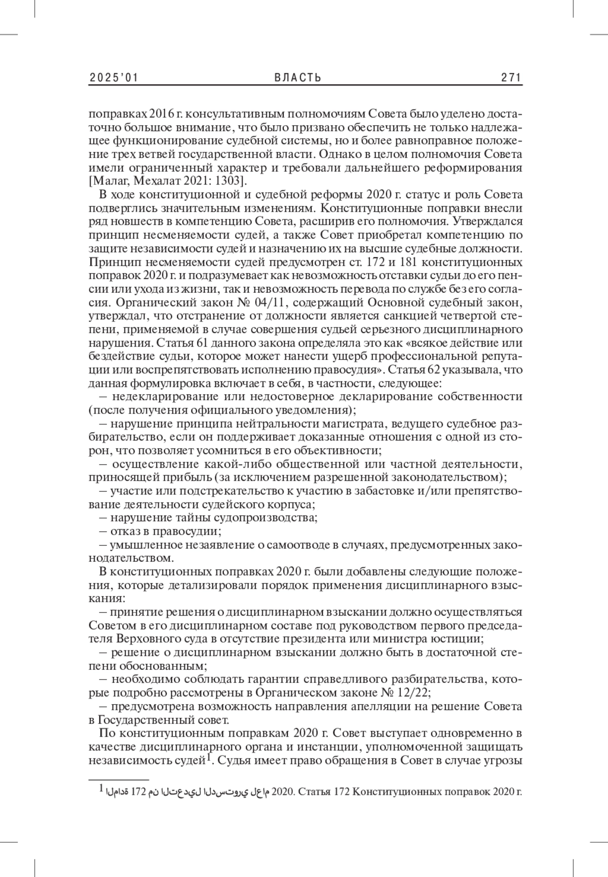 2. 	Малаг С., Мехалат Б. 2021. Высший совет магистратуры: организационная структура и совещательные функции. - Алжирский журнал “Голос закона”. № 7(3). С. 1301-1320 [سعيد معلق، بلقاسم مخلط. المجلس الأعلى للقضاء: البنیة الھیكلیة والوظیفة الاستشاریة // مجلة “صوت القانون”، المجلد 07، العدد 03، 2021. ص. 1320-1301.].