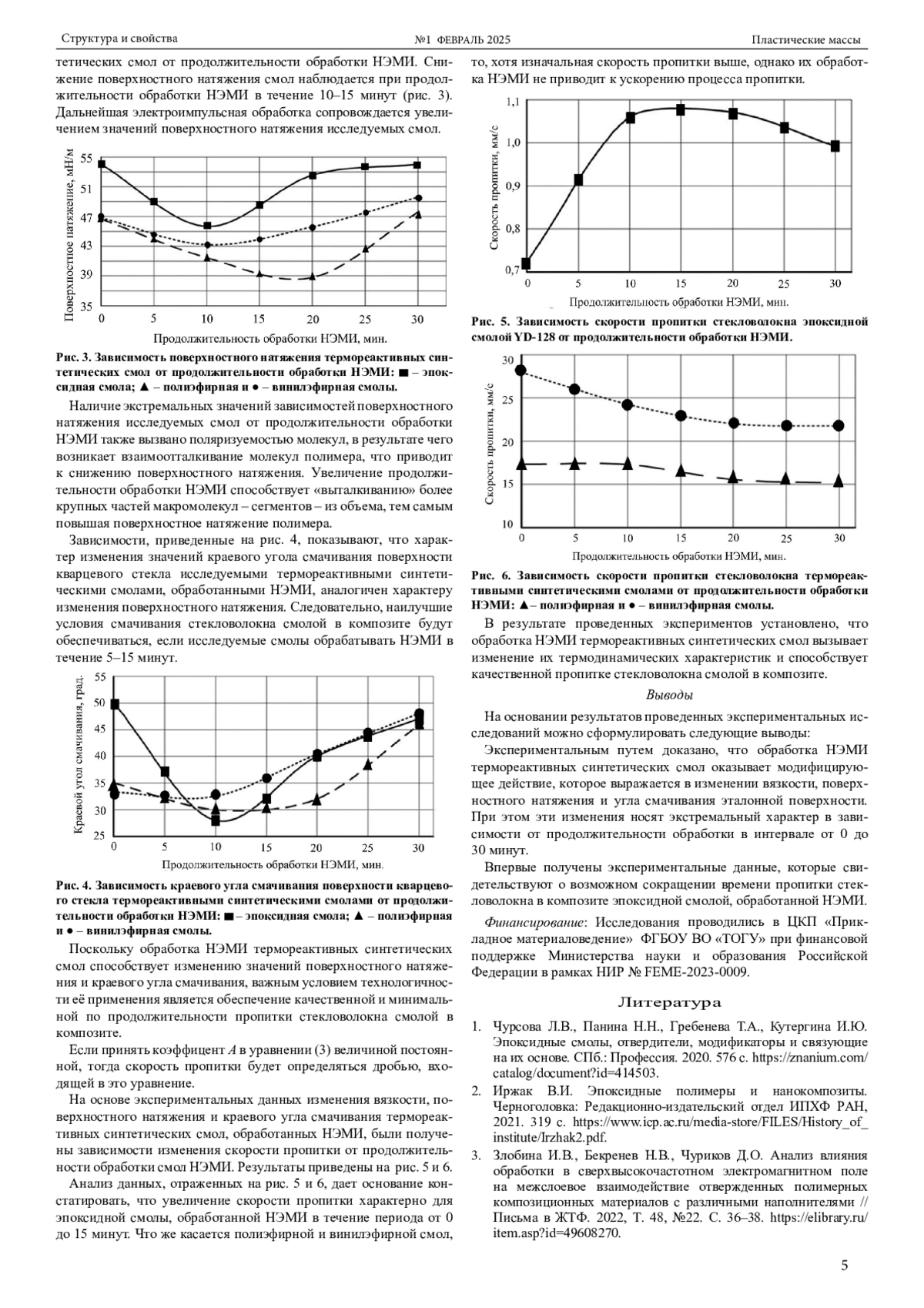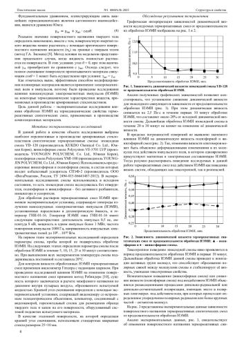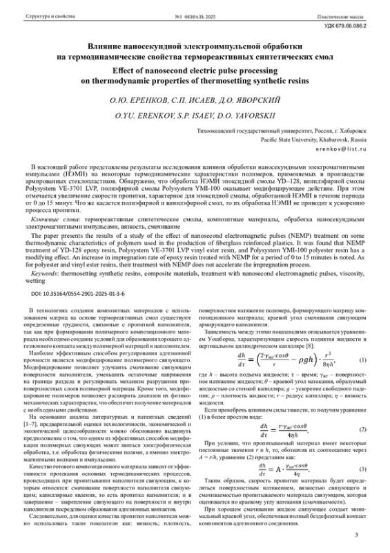 В настоящей работе представлены результаты исследования влияния обработки наносекундными электромагнитными импульсами (НЭМИ) на некоторые термодинамические характеристики полимеров, применяемых в производстве армированных стеклопластиков. Обнаружено, что обработка НЭМИ эпоксидной смолы YD-128, винилэфирной смолы Polysystem VE-3701 LVP, полиэфирной смолы Polysystem YMI-100 оказывает модифицирующее действие. При этом отмечается увеличение скорости пропитки, характерное для эпоксидной смолы, обработанной НЭМИ в течение периода от 0 до 15 минут. Что же касается полиэфирной и винилэфирной смол, то их обработка НЭМИ не приводит к ускорению процесса пропитки.