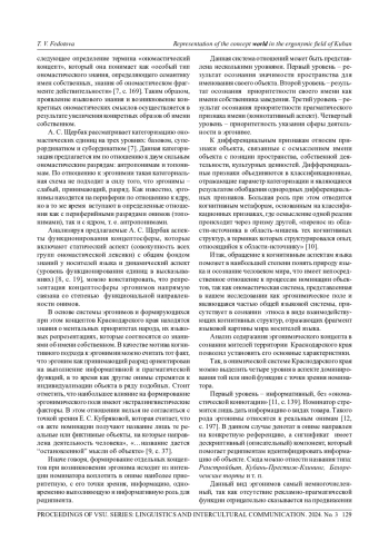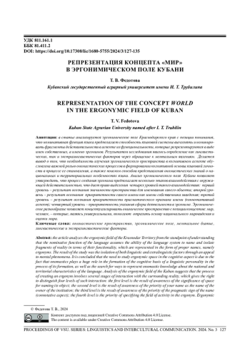 В статье анализируется эргонимическое поле Краснодарского края с позиции понимания, что номинативная функция языка предполагает способность языковой системы вычленять и номинировать фрагменты действительности в аспекте их функциональности, которые репрезентируются в виде имен собственных, а именно эргонимов. Результатом исследования явилось определение как лингвистических, так и экстралингвистических факторов через обращение к ментальным явлениям. Делается вывод о том, что необходимость изучения эргонимического пространства в когнитивном аспекте обусловлена важной ролью ономастических процессов в формировании когнитивной основы языковой личности в процессе ее становления, а также поиском способов представления ономастических знаний о национальных и территориальных особенностях языка. Анализ эргонимического поля Кубани позволяет утверждать, что процесс создания эргонима предполагает несколько этапов взаимодействия с окружающей действительностью, что дает право выделения четырех уровней такого взаимодействия: первый уровень - результат осознания значимости пространства для именования своего объекта; второй уровень - результат осознания приоритетности своего имени как имени собственника заведения; третий уровень - результат осознания приоритетности прагматического признака имени (коннотативный аспект); четвертый уровень - приоритетность указания сферы деятельности в эргониме. Эргонимическое разнообразие позволяет концептуализировать онимическое пространство с позиции концептов: мир, человек, - которые, являясь универсальными, помогают отразить основу национального мировидения и оценки мира.