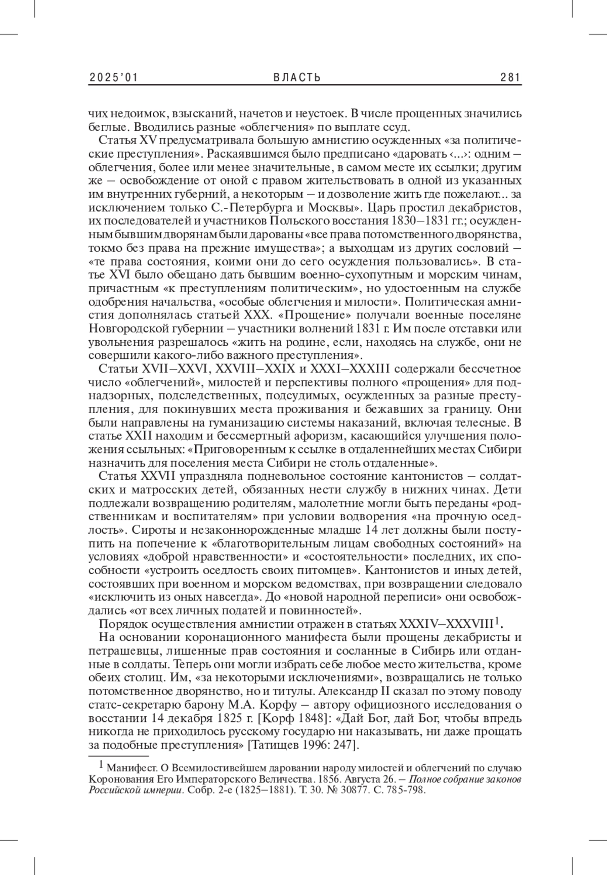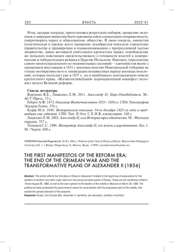 В статье отражены первые шаги императора Александра II, связанные с началом подготовки отмены крепостного права и других крупных реформ в общественном и государственном строе России. Здесь можно отметить манифесты от 19 марта и 26 августа 1856 г., а также речь царя перед предводителями дворянства в Москве 30 марта 1856 г. Политическая амнистия символизировала стремление правительства к примирению с прогрессивной частью дворянства, желавшей скорейшего освобождения крестьян.