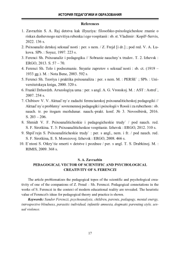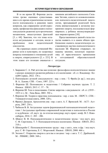 3. Ференци Ш. Психоанализ и педагогика // Собрание научных трудов. Т. 2. Ижевск : ERGO, 2013. С. 57 - 70.