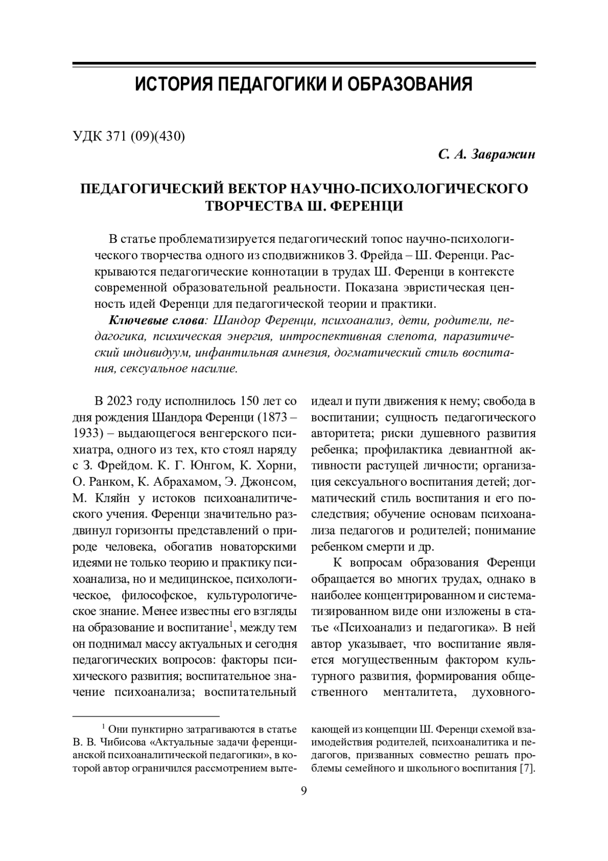 В статье проблематизируется педагогический топос научно-психологического творчества одного из сподвижников З. Фрейда – Ш. Ференци. Раскрываются педагогические коннотации в трудах Ш. Ференци в контексте современной образовательной реальности. Показана эвристическая ценность идей Ференци для педагогической теории и практики.