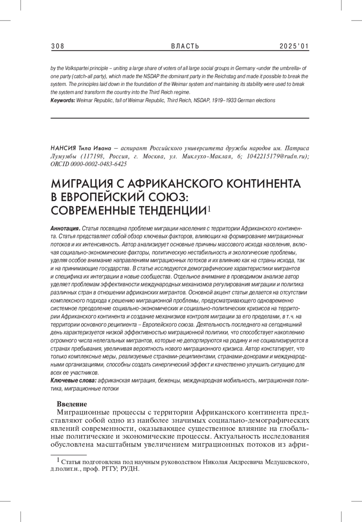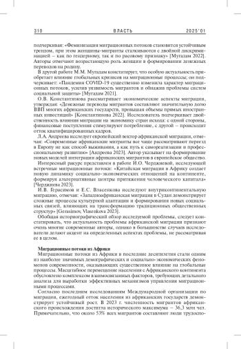 3. 	Константинова О.В. 2022. Миграция как фактор экономического развития Африки. - Эпоха науки. № 32. С. 122-130. EDN: KYRRFE
